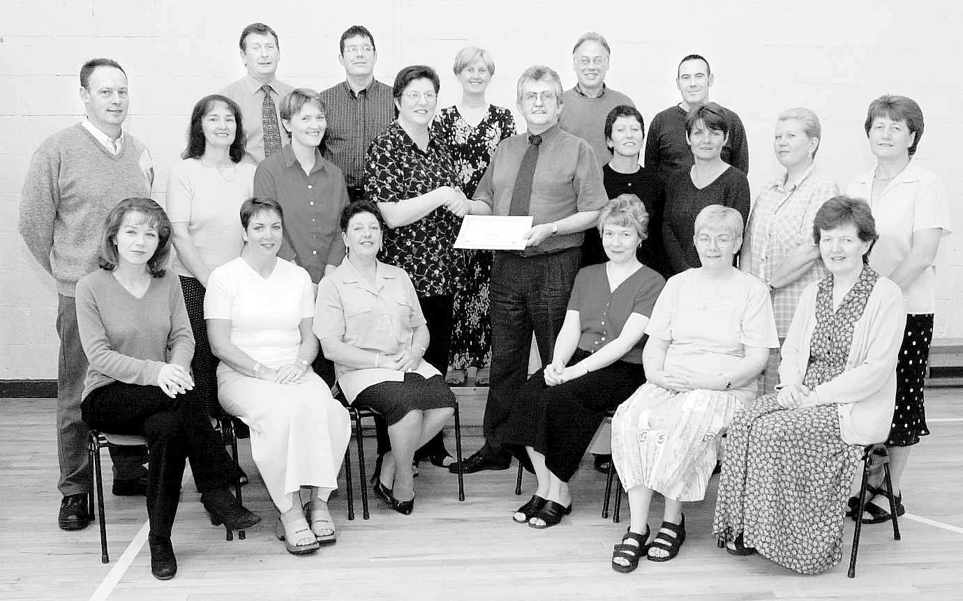 Dermot Brady, principal, congratulates Patricia Collins and members of the teaching staff at St. Therese's Primary School, Lenamore, after completing "The Learning Line ICT NOF Training" course.
