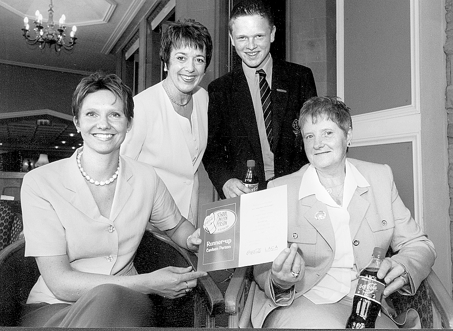 Pictured at the presentation of the Coca-Coal Canteen Person of the Year are, from left, Clare Megarry, Coca-Cola, Anne Campbell, Local Authorities Caterers Assoc., Declan Forbes, nominating pupil, St Peter's High School and Maureen McGuigan, St Peter's High School, runner-up Canteen Person of the Year.