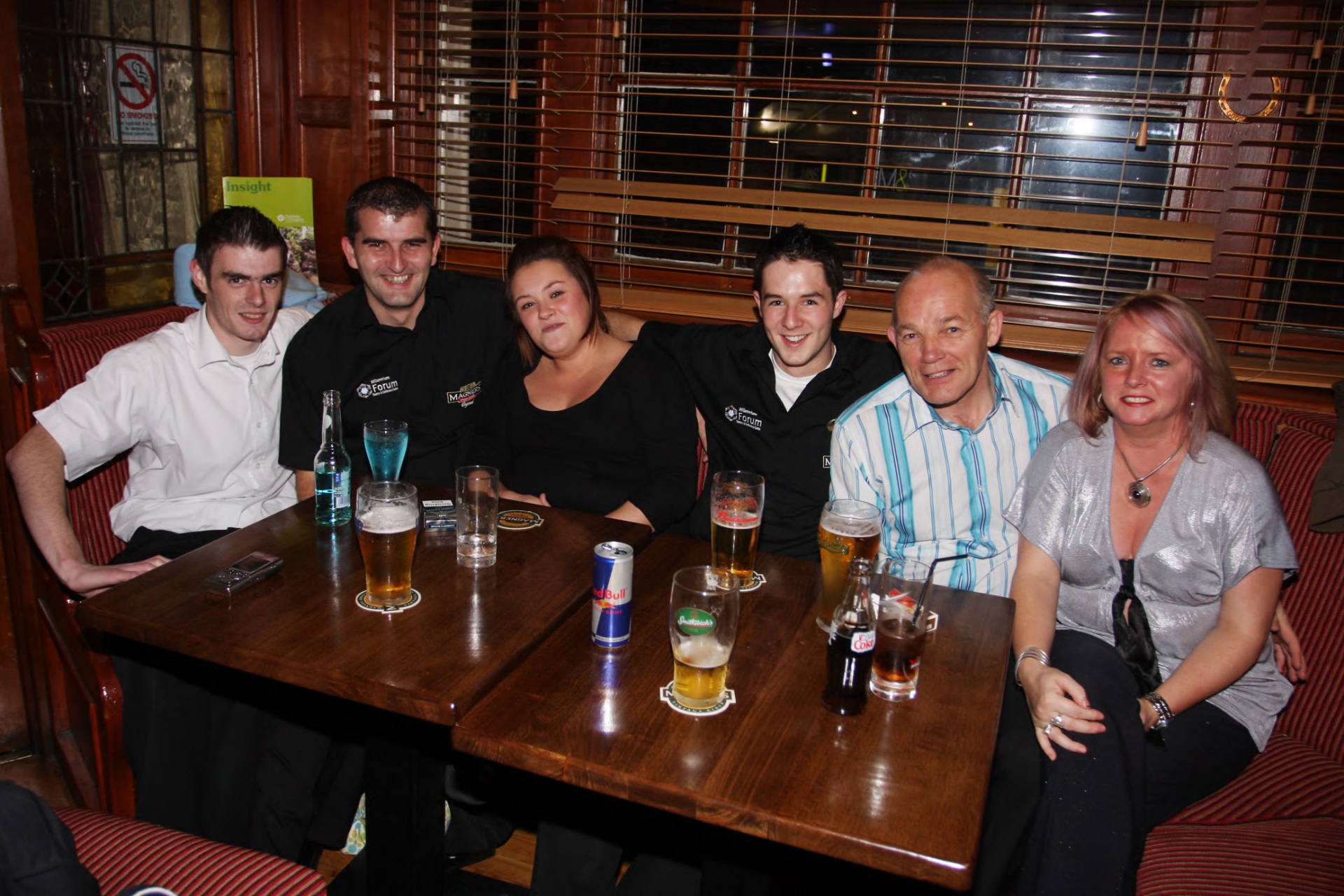 The Millennium Forum staff enjoying a drink after work, Kathy, Maurice, Barry, Fionula, Owen & Thomas.