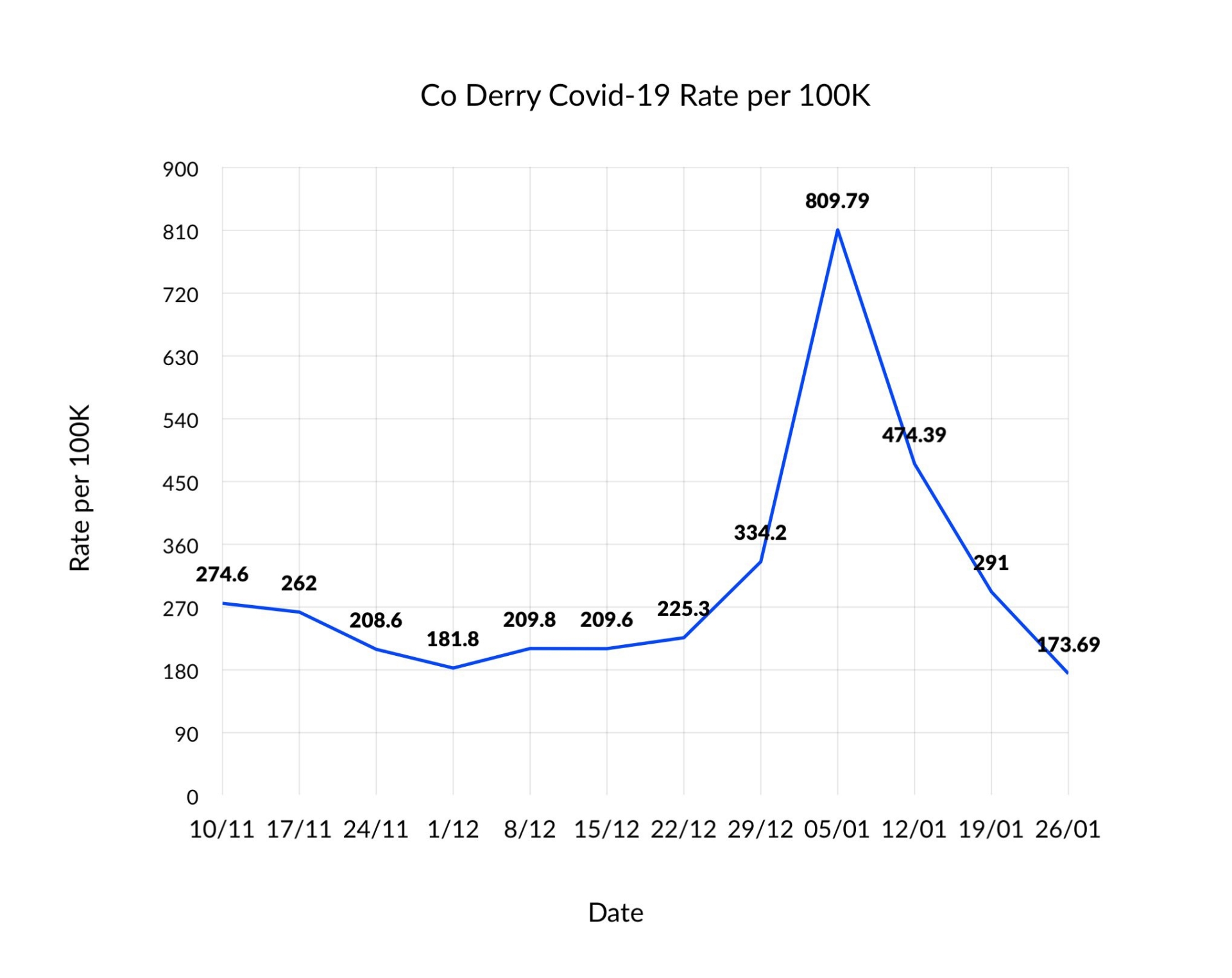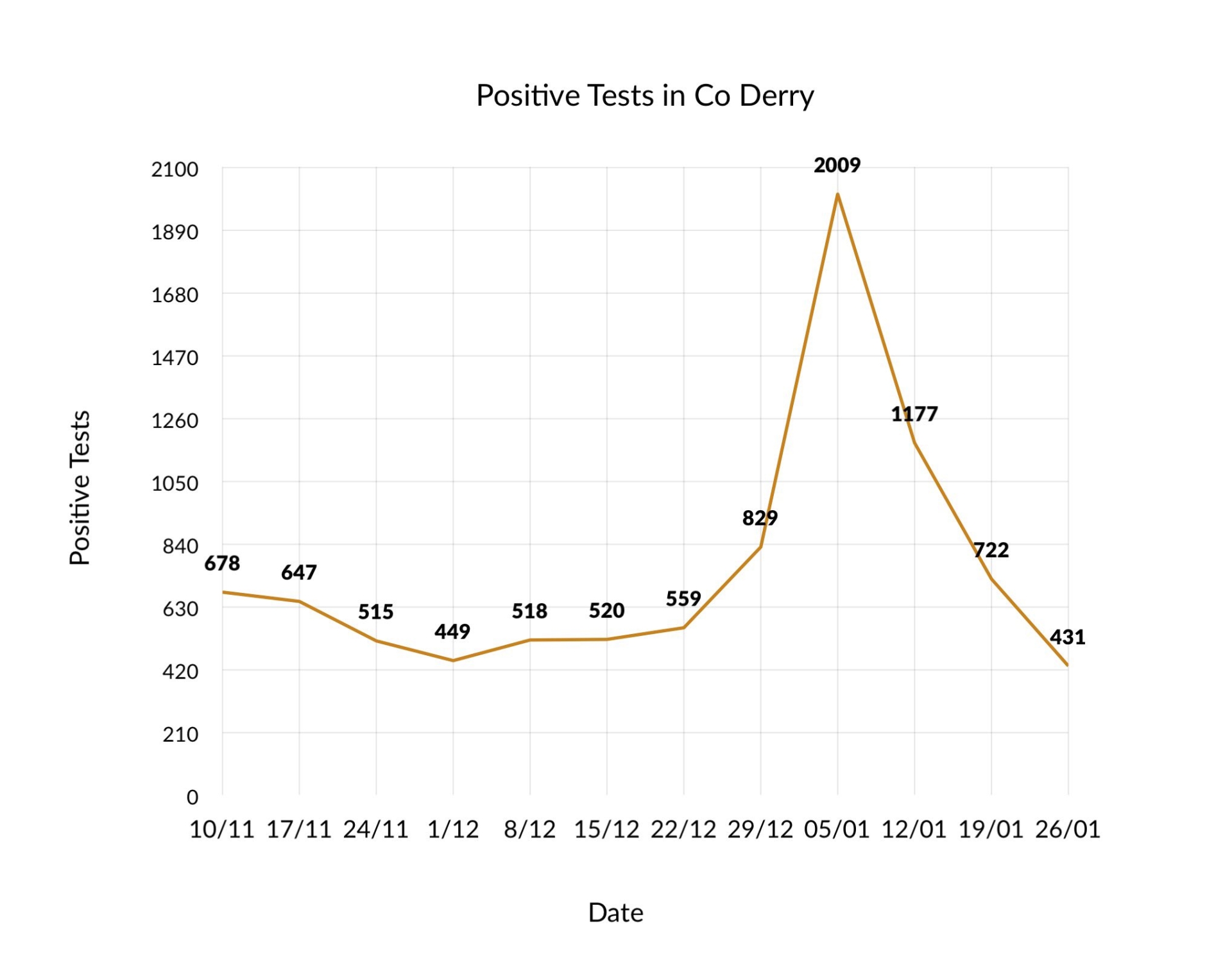 Overall, 9.6% of tests carried out in County Derry over the last seven days were positive, the lowest figure since December 22.