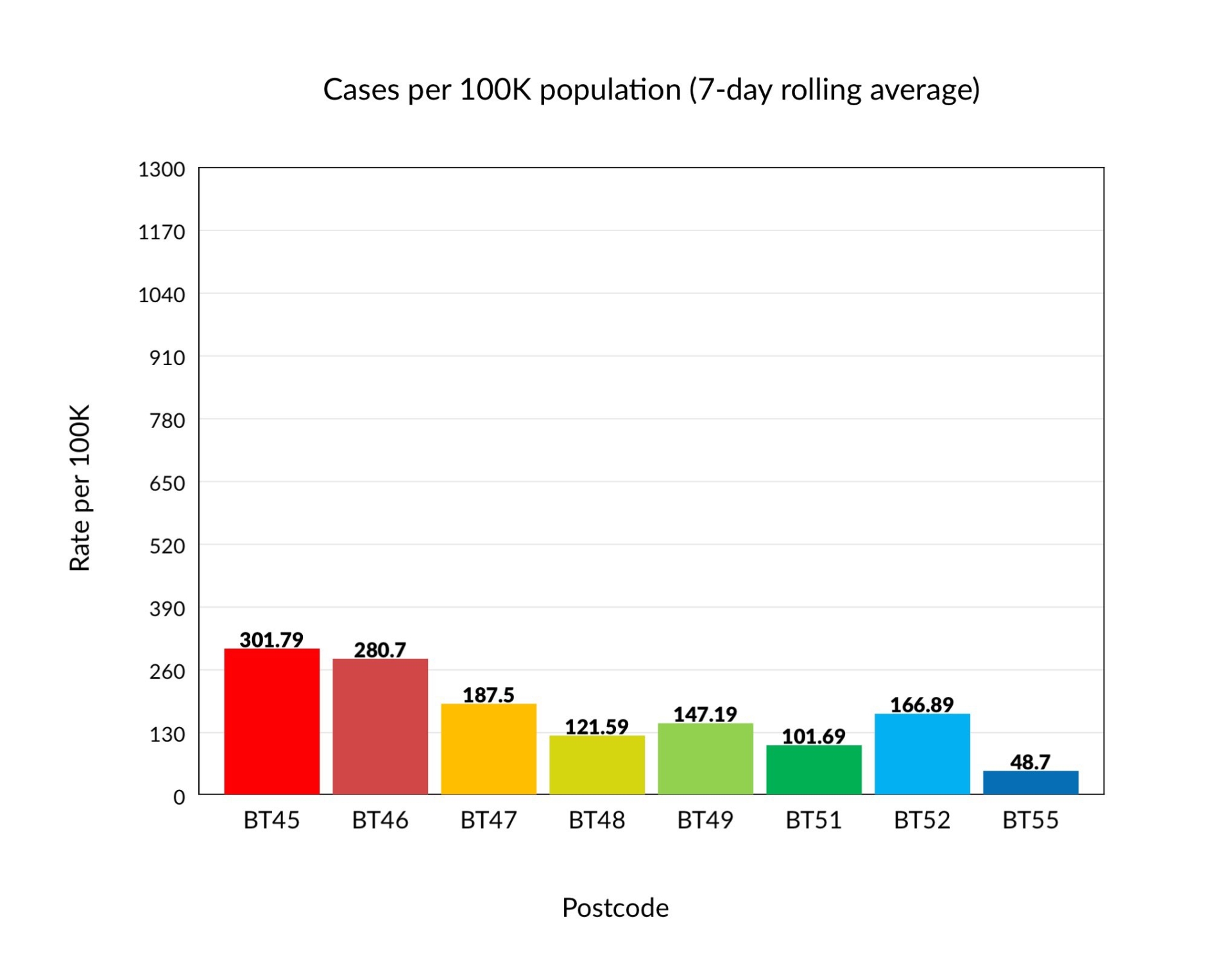 Cases in Garvagh's BT51 postal area fell by 57.1%, the highest drop of all postcodes, while the lowest decrease was recorded in BT47, where cases fell by 18.9%.