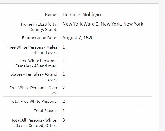Census data from 1820 showing Hercules Mulligan's female slave.