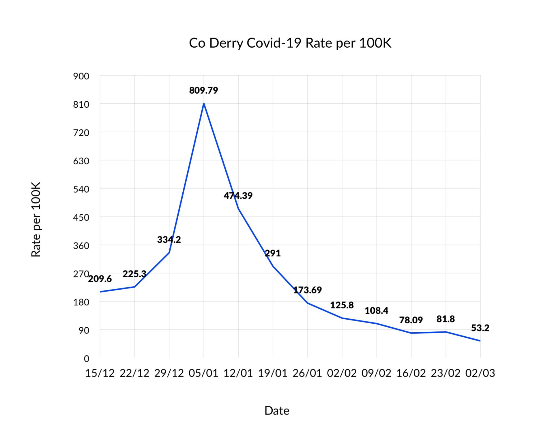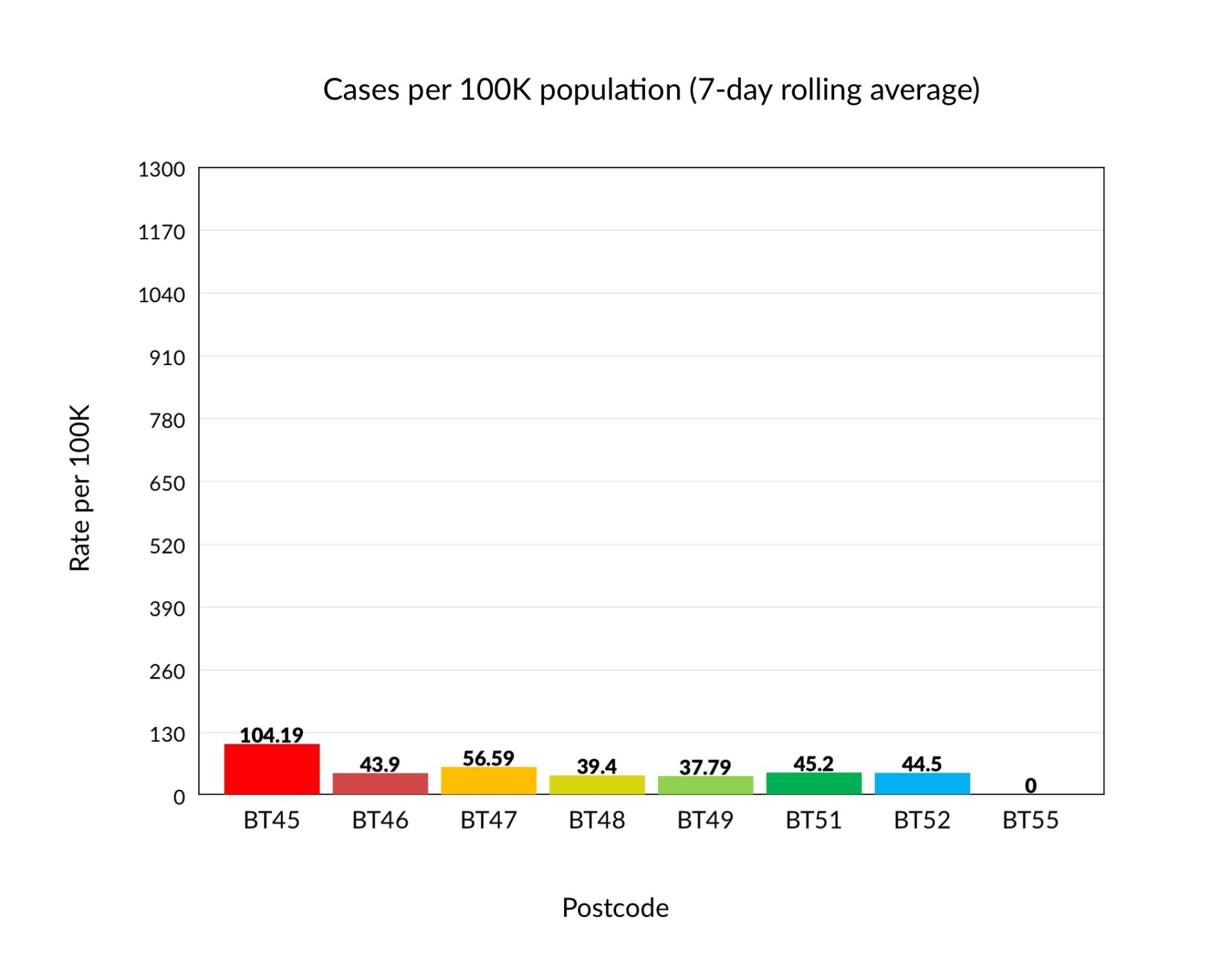 Magherafelt no longer has the highest rate in Derry, with Limavady taking over the mantle at 71.5. Portstewart retains the lowest rate, but one identified case has pushed it up from zero to 12.2.
