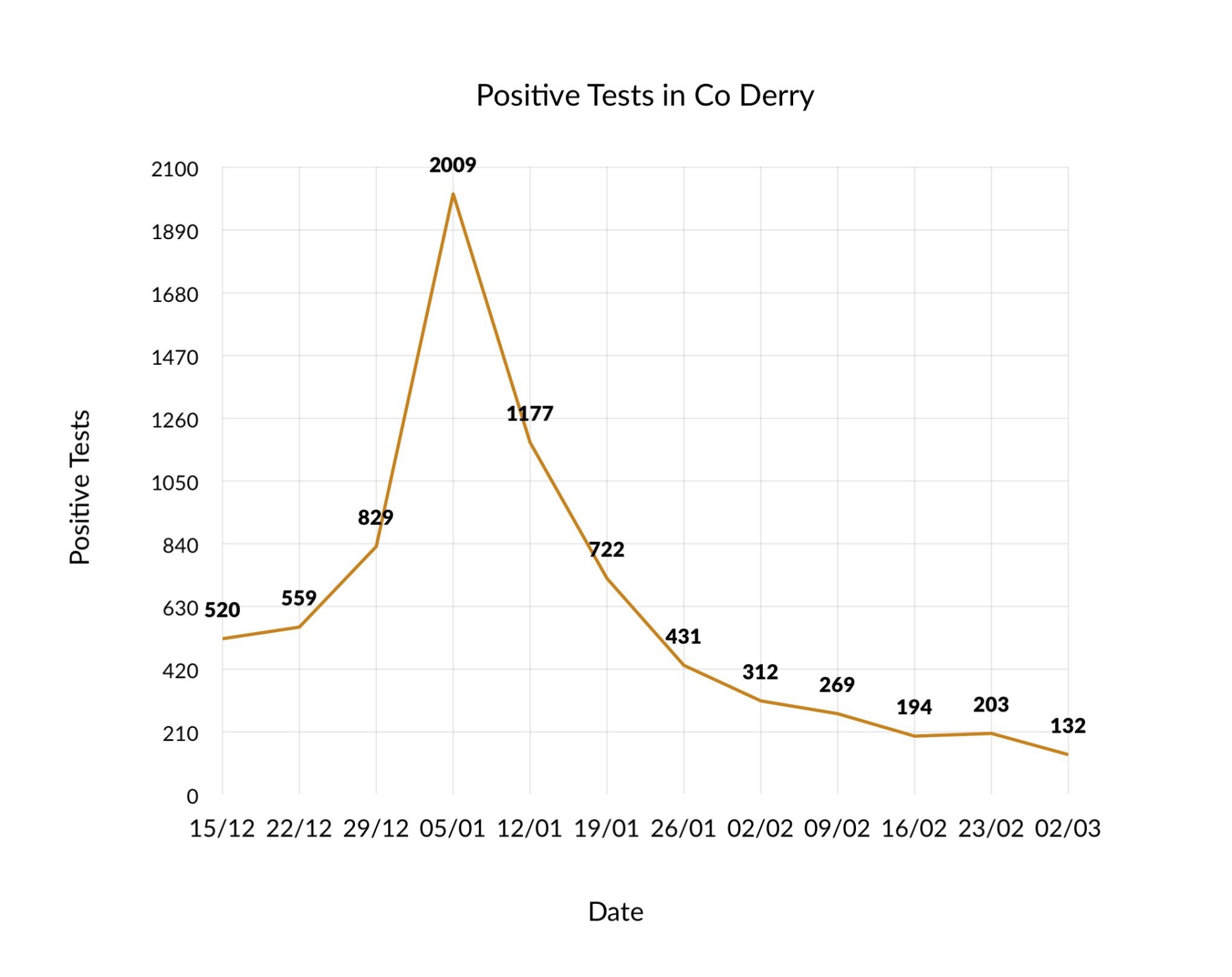 Maghera (6.5%) experienced the highest percentage of positive cases, with Portstewart (1.1%) recording the lowest. Just 2.9% of the 3,296 tests completed in the county were positive.