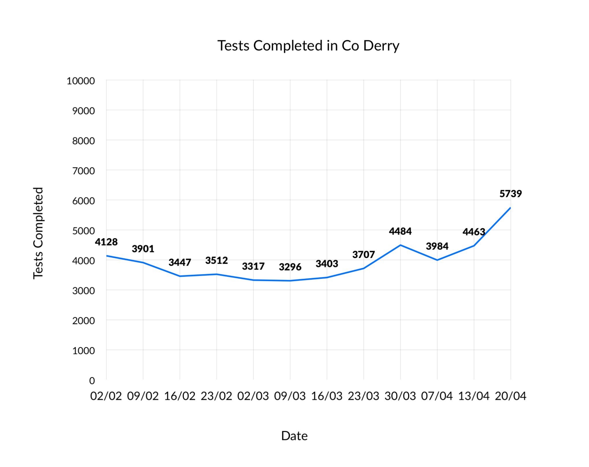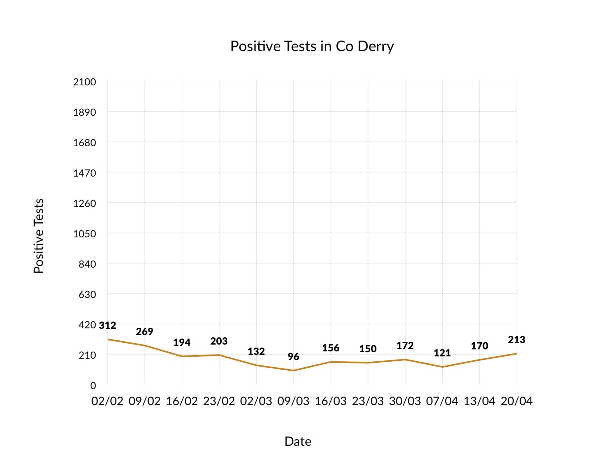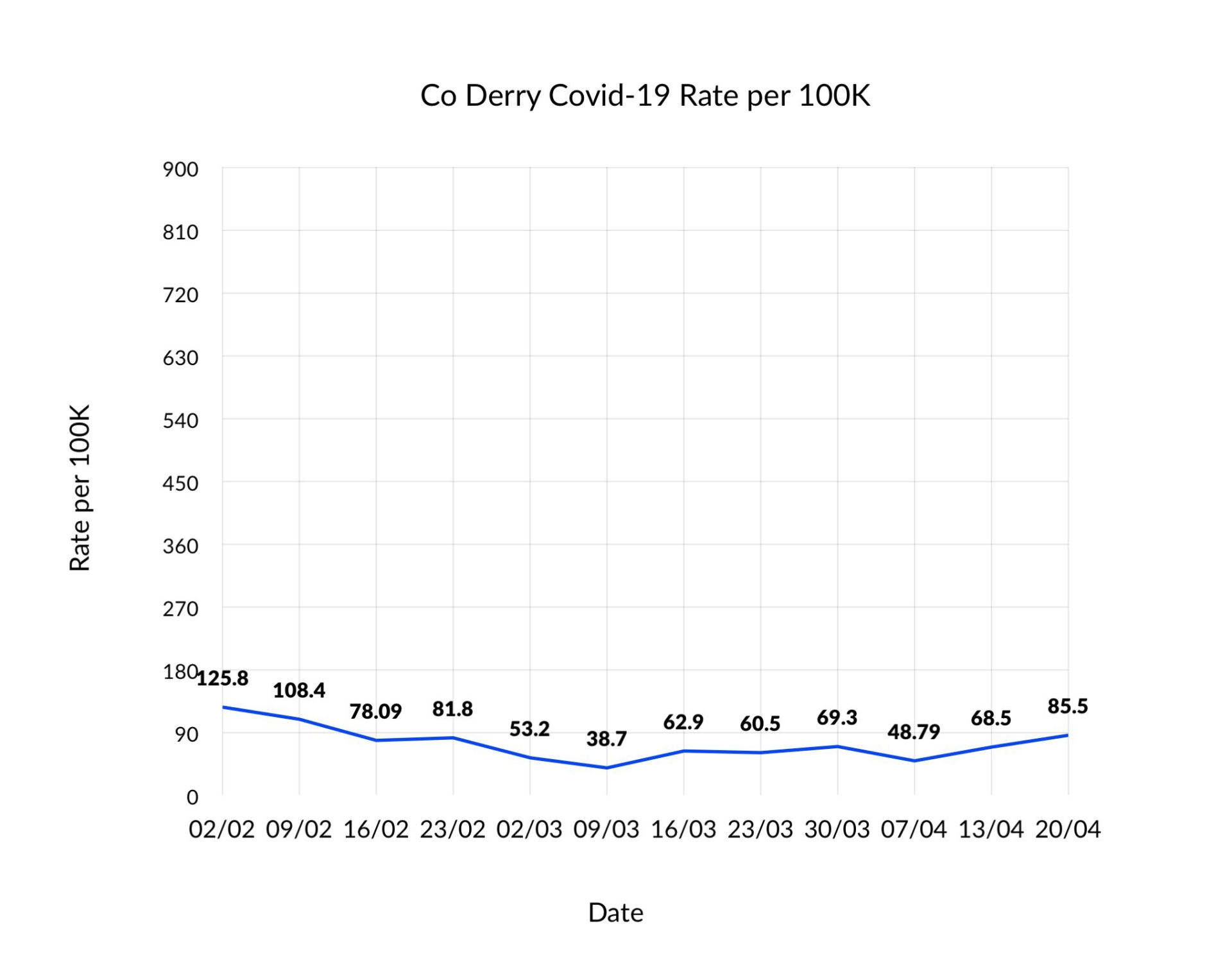 8.1% of Covid tests completed in BT48 over the last seven days were positive, as were 4.4% of tests completed in Magherafelt. All other areas had a positive rate of below 2%.