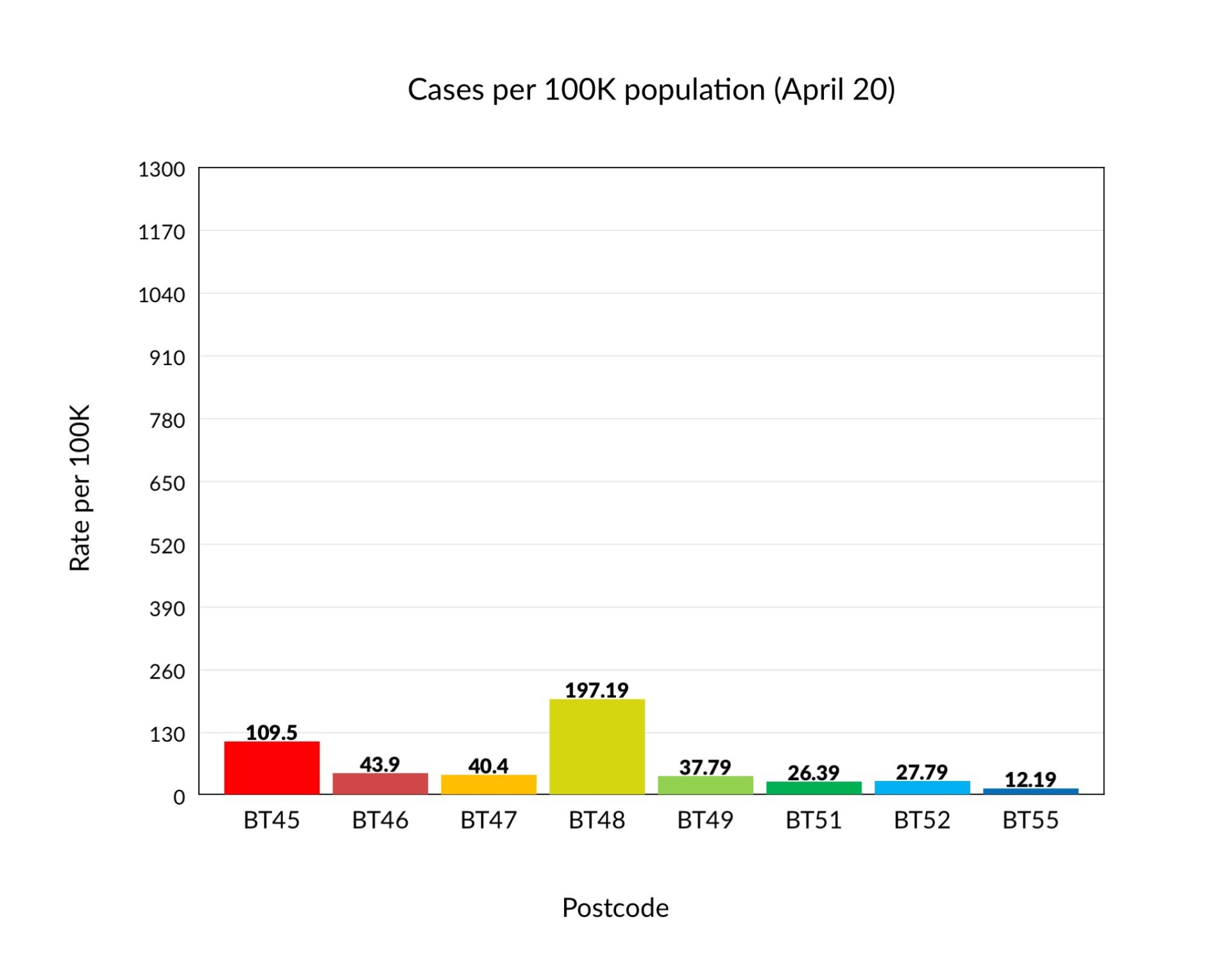 BT48's rate per 100,000 of population (197.2) is the second highest in Northern Ireland, behind only Augher (BT77), where just six cases was enough to push its rate to 382.2.