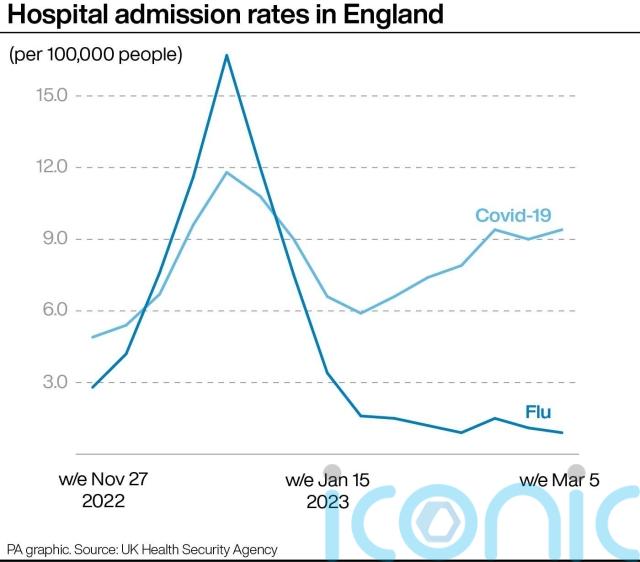 Separate UKHSA figures show the rate of hospital admissions in England for people with Covid-19 has risen slightly, standing at 9.4 per 100,000 last week, up from 9.0 the previous week.