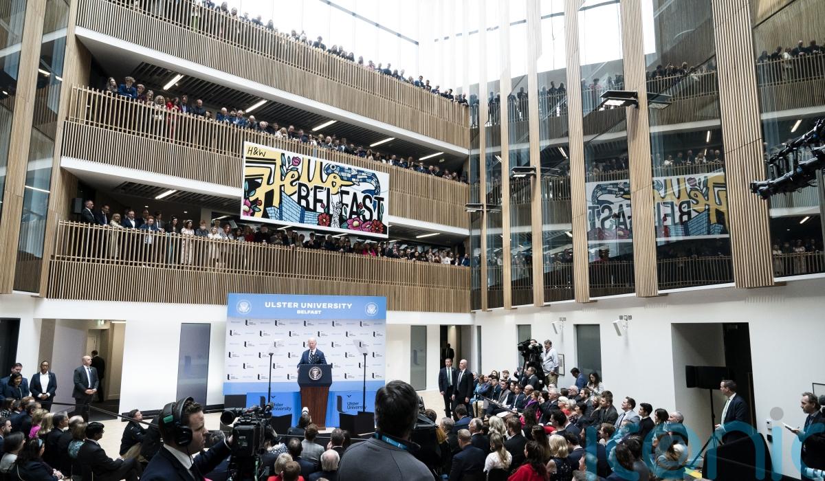 US President Joe Biden has extolled the “dividends of peace” as he addressed a gathering at a new university campus in Belfast city centre.