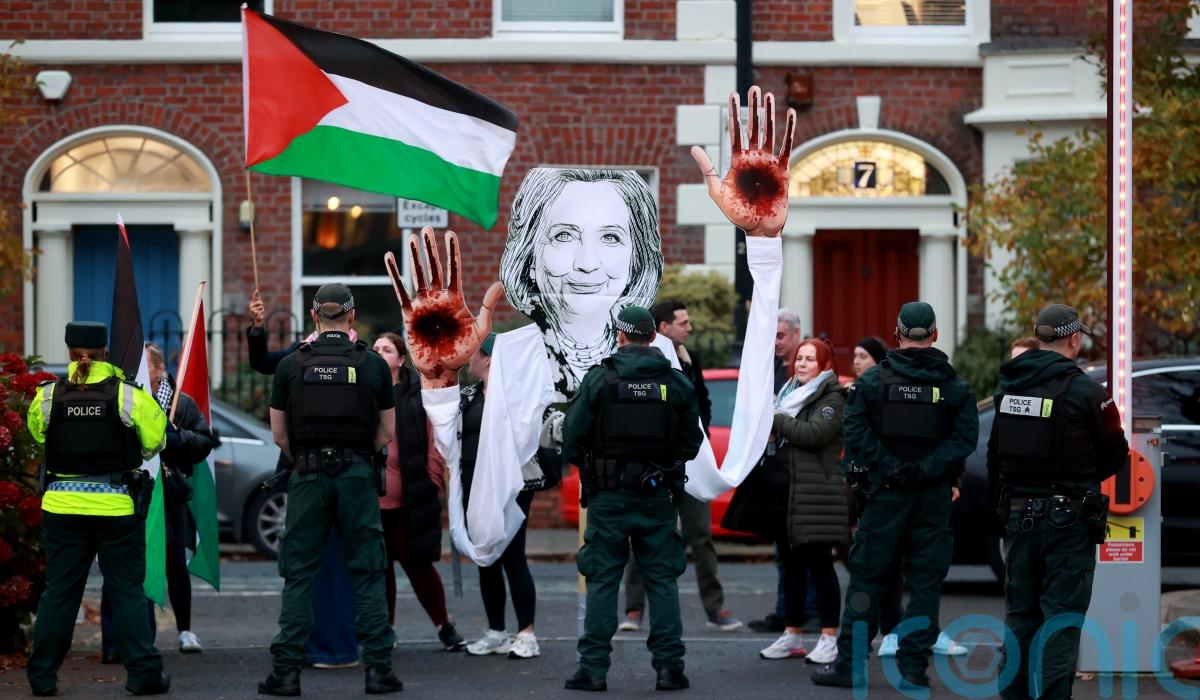 Protesters chanted “shame” and carried Palestine flags and a cut-out of Mrs Clinton depicted with blood on her hands.