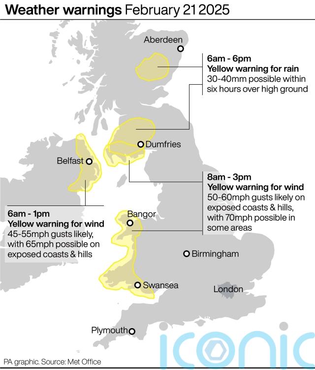 Another warning for strong winds runs from 8am until 3pm for south-west Scotland and West Wales on Friday, while a yellow wind warning will be in place in the east of Northern Ireland from 6am to 1pm.