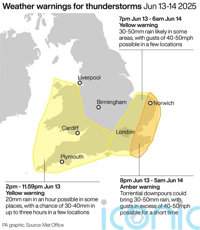 While many areas within the warning zone may escape severe weather, torrential downpours could bring 30–50mm of rain in a short time before conditions ease on Saturday morning.