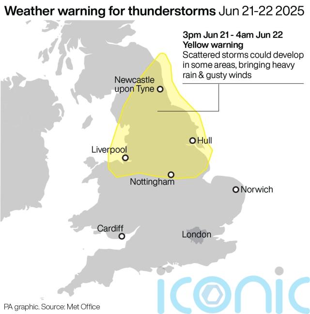 A yellow warning for thunderstorms covering parts of south-east Scotland, Yorkshire, the Midlands and Wales has been issued by the Met Office as it said there could be frequent lightning, large hail, strong winds and heavy rain in the affected areas.