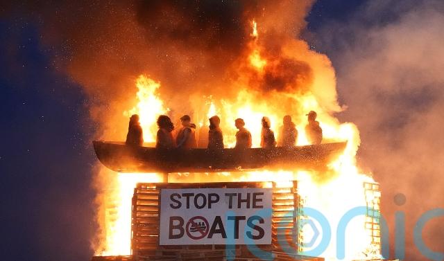 The boat on top of the bonfire contained more than a dozen life-sized mannequins wearing life jackets.