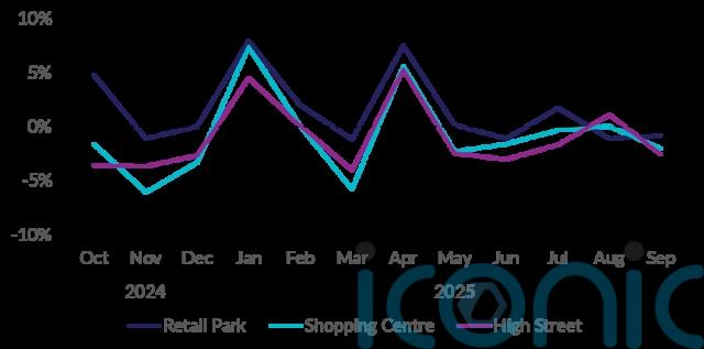 High street footfall decreased by 2.5% year on year in September while visits to retail parks and shopping centres were down 0.8% and 2% respectively.