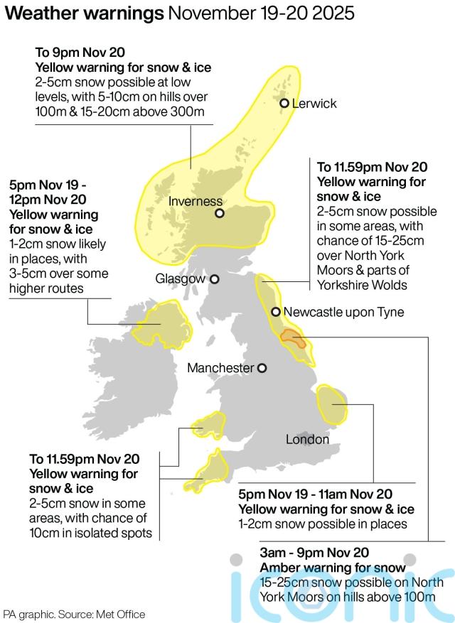The Met Office said in the yellow weather warning areas, there may be possible travel delays on roads, delays and cancellations on public transport services, and the risk of injury because of slippery terrain is higher than usual.