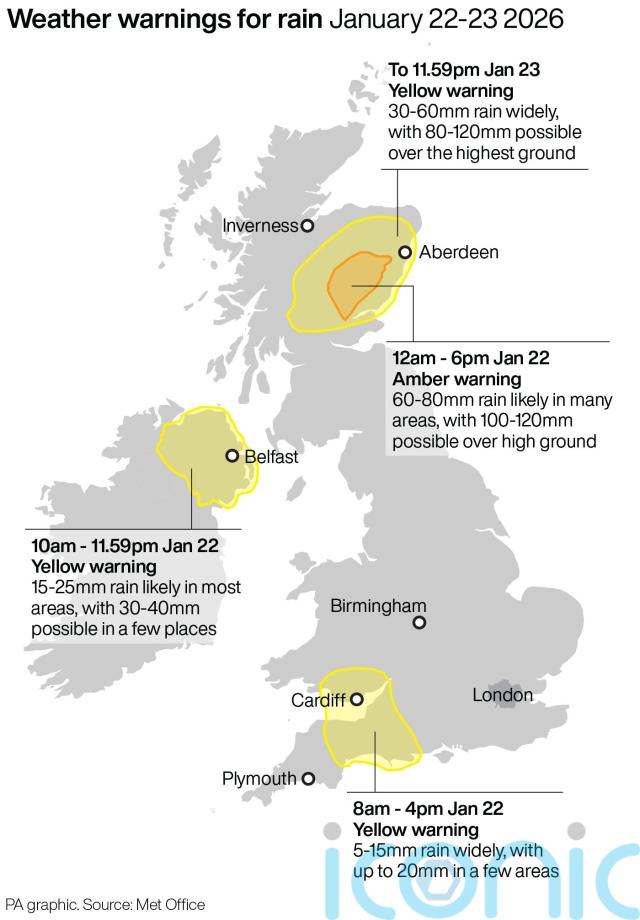 A yellow warning of rain is also in place for part of Scotland, while the Met Office has issued further yellow warnings for Northern Ireland and parts of south Wales and south-west England.