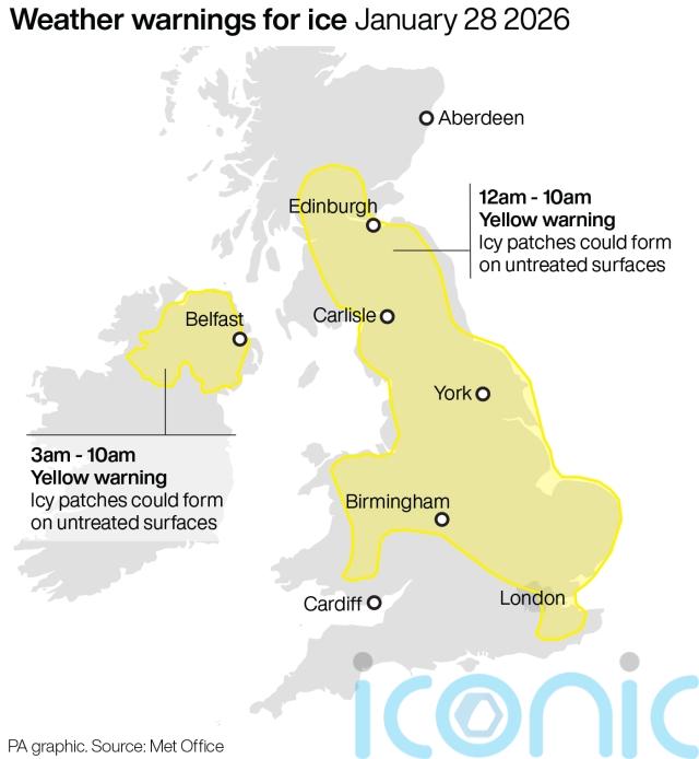 Yellow warnings were also issued for ice on Wednesday, covering much of England and Northern Ireland.