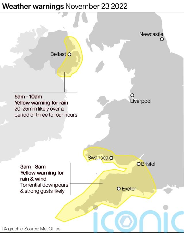 The Met Office has issued yellow weather warnings for parts of Wales, southern and western England, Northern Ireland and southern Scotland.