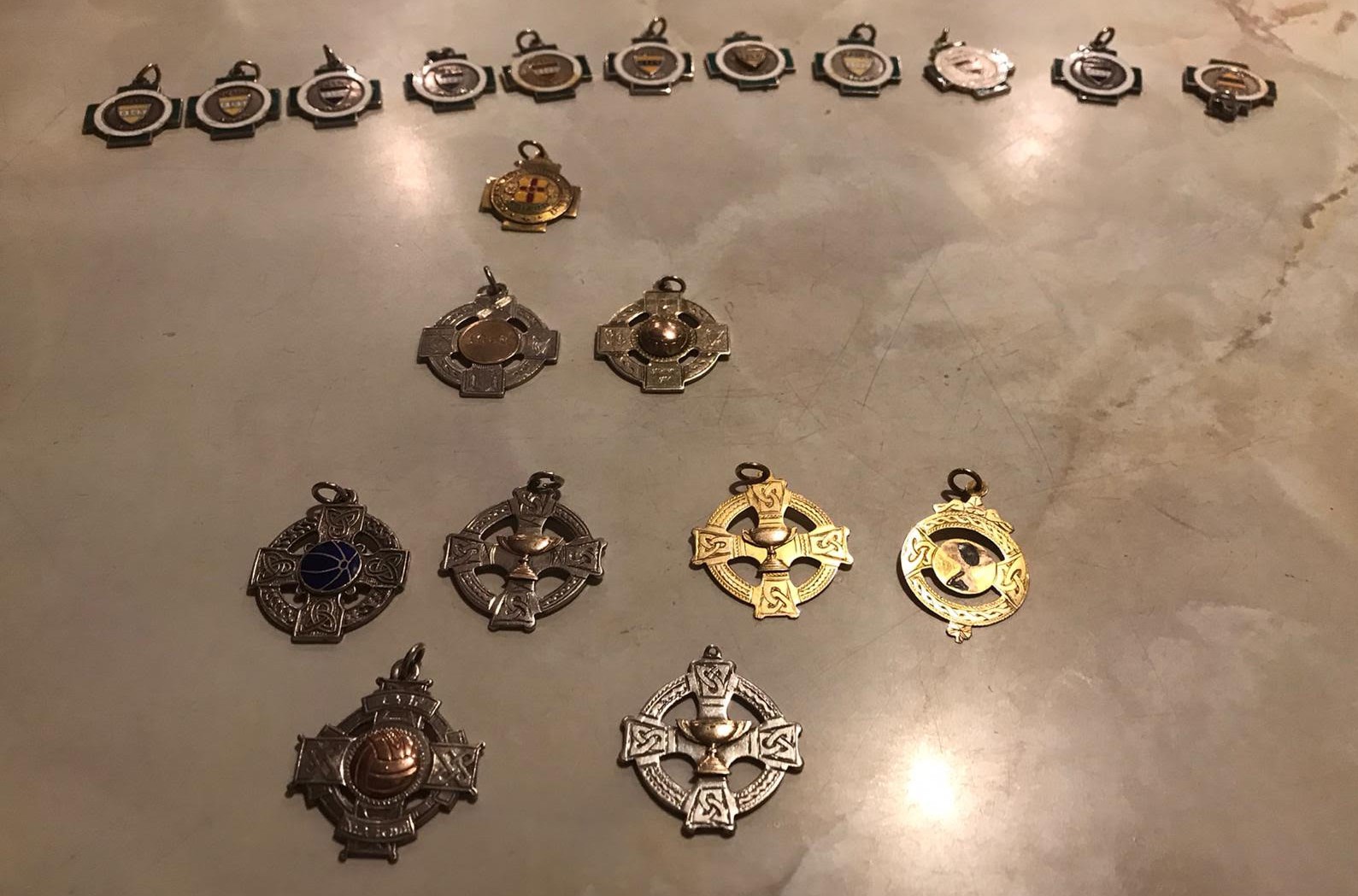 Tom's medal collection, with 11 of his Derry championship medals along the top. He gave his 12th to his oldest grandchild Niall (Pic: The Scullion family)