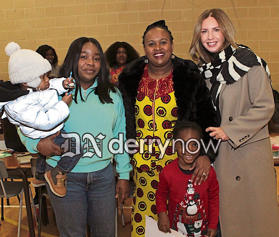 Sinead Corns, Apex Housing Good Relations Officer pictured with Doreen Murugi, Vice Chair and Fi Fi, Children's Officer at the Africian Caribbean Cultural Celebration.