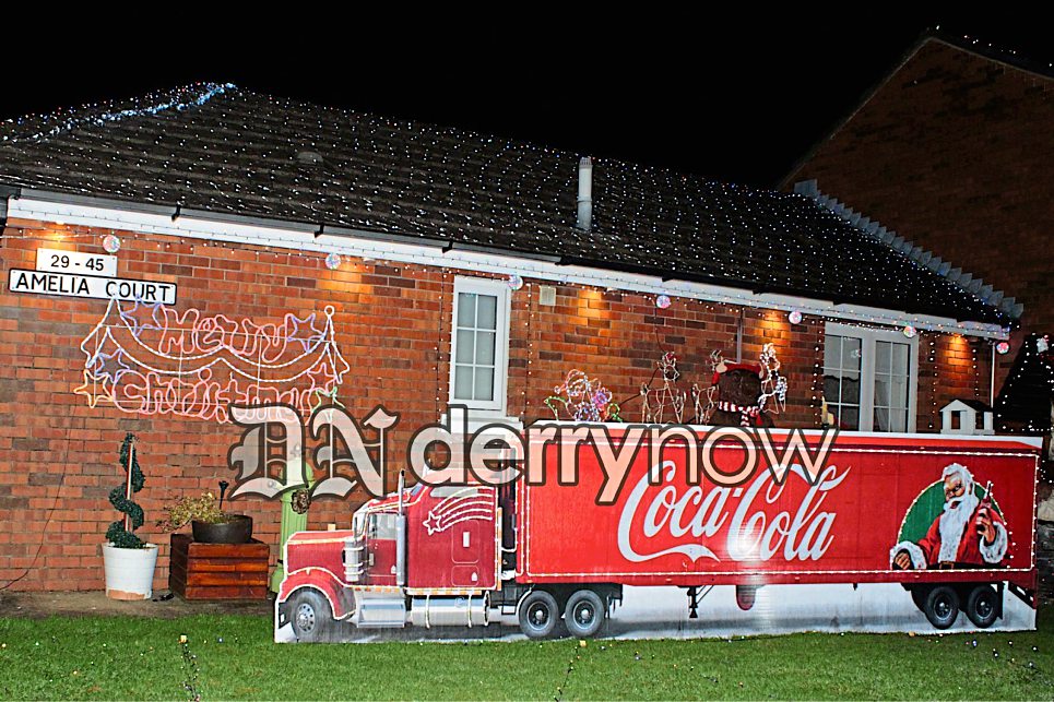 Amelia Court lights up for Mr and Mrs Clause in aid of Foyle Hospice and MacMillan Cancer.