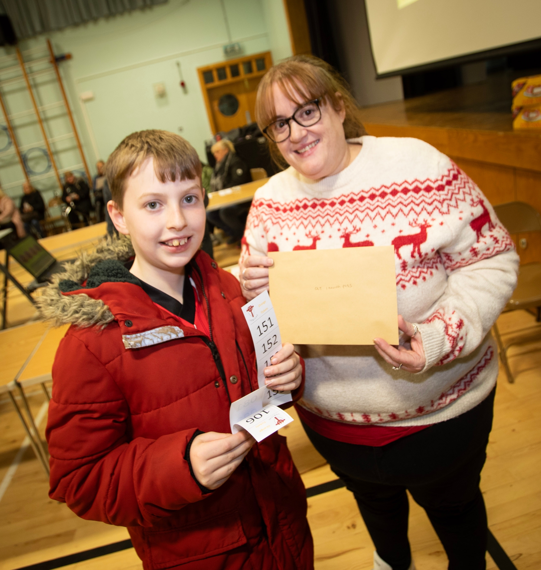 Peter Page picks up her prize from Lisa Grant at St. Joseph's Boys School Annual Christmas Rickety Wheel on Thursday night at the school.