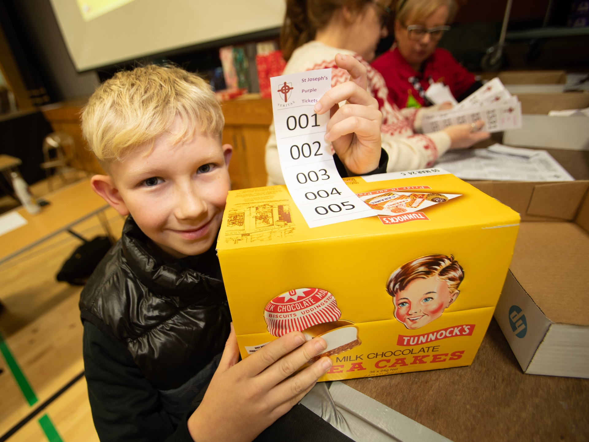 Young Michael Morrow delighted with his Tunnock Teacakes, won at the St. Joseph's Wheel of Fortune on Thursday night. (Photos: Jim McCafferty Photography)