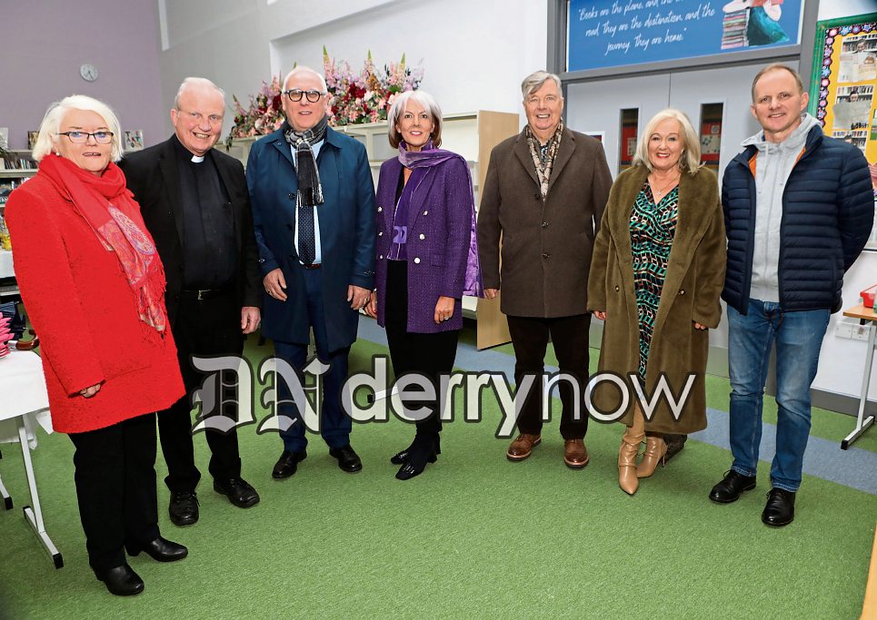 Mary Jo O’Carolan, principal, St. Cecilia's College, with special guests, from left, Grianne McCafferty, Bishop Donal McKeown, Pat Armstrong, and from right, Mark McConnellogue, Kathleen O'Hare and Eamon O'Hare. (Photos - Tom Heaney, nwpresspics)