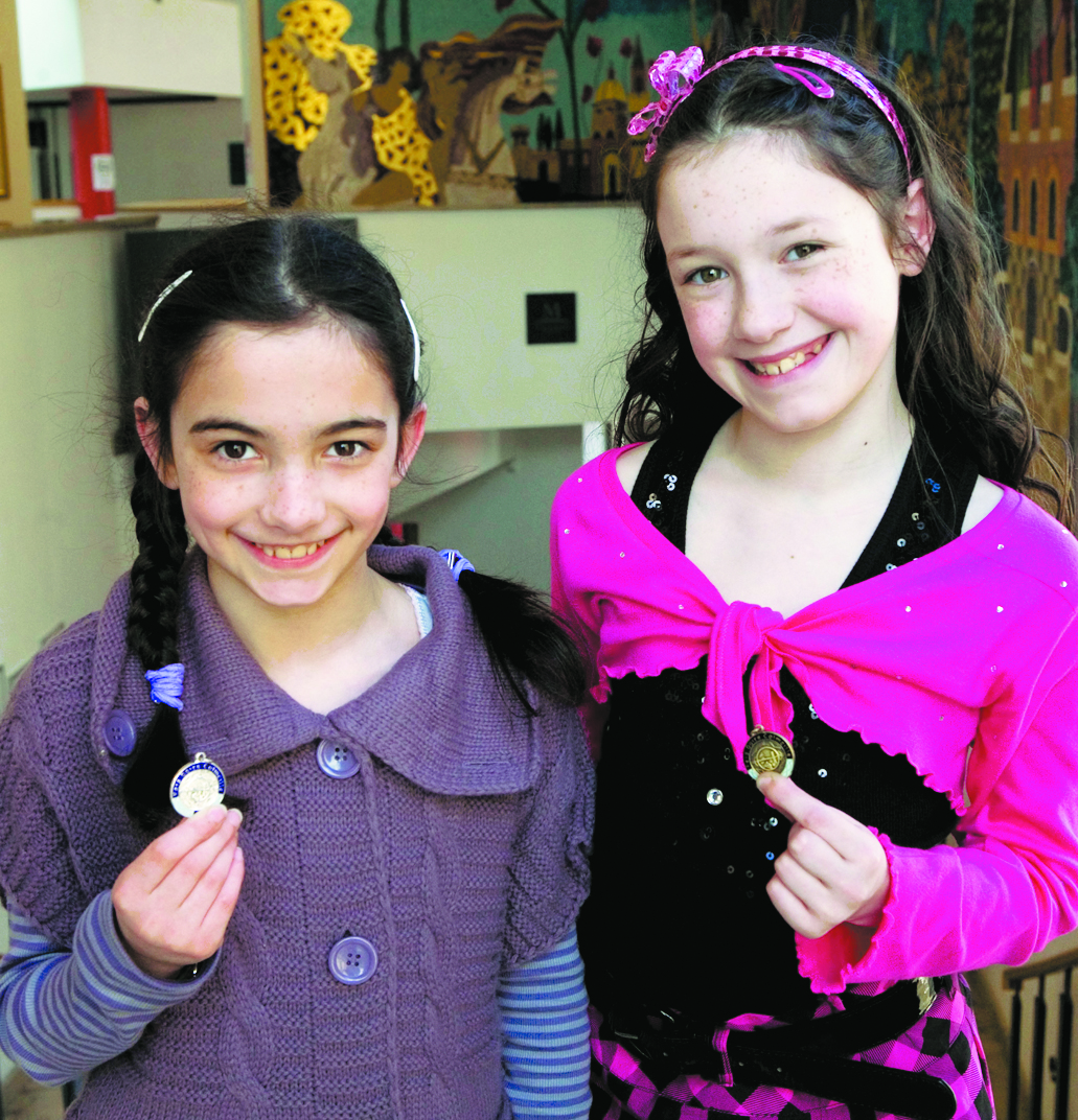 Brenna Coyle (on left), 2nd in the P6 Irish Verse, and her sister, Bridget, 3rd in the same competition at Feis Dhoire Cholmcille.