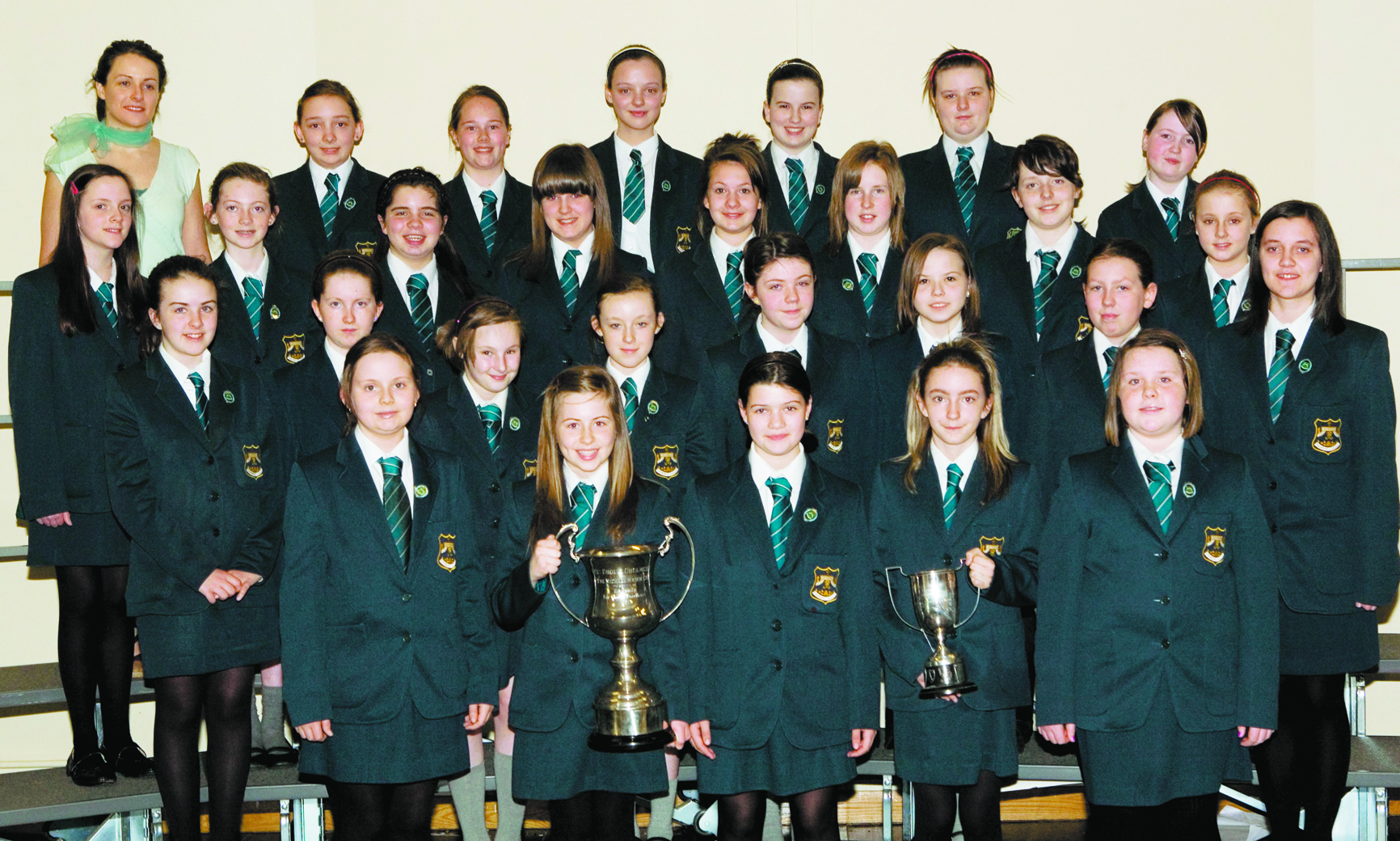 Thornhill College Year 8 choir, winner of the Thornhill Past Pupils' Union Cup for the irish Music Competition and the Michael Mason Cup for best overall choir at Feis Dhoire Cholmcille. Included is choir director Margaret McCay.