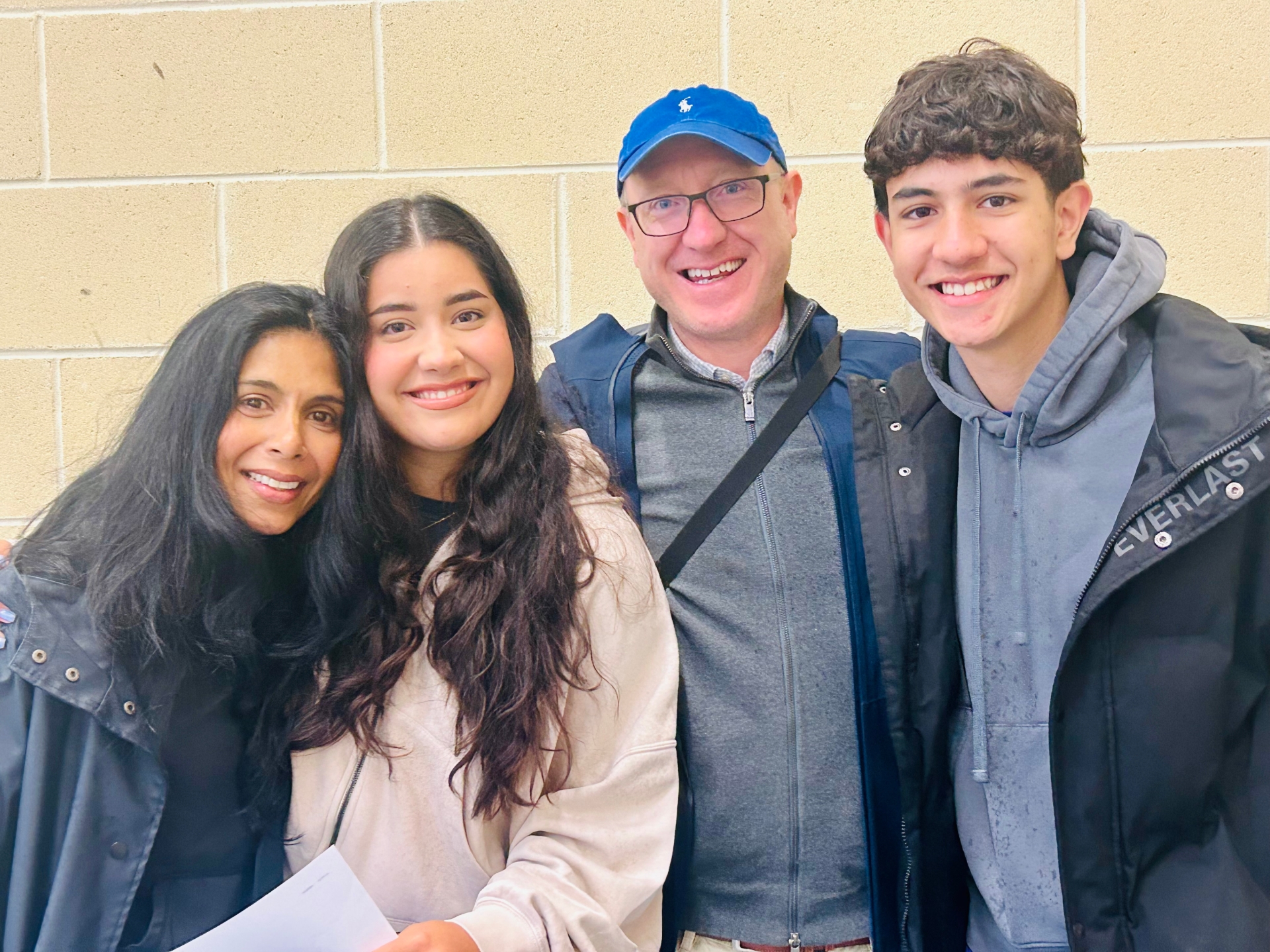 A smiling Sophia McGinnis sharing her fantastic A Level outcomes with her parents and brother.