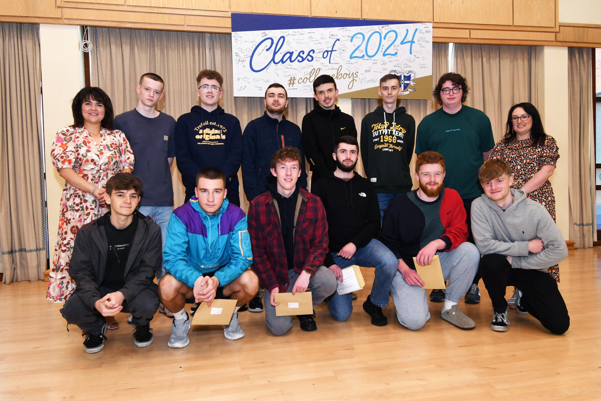 Caroline McLaughlin, right, Principal, and Noleen Barr, Head of Year, pictured with some of the high achievers at St. Columb's College on Thursday morning.
