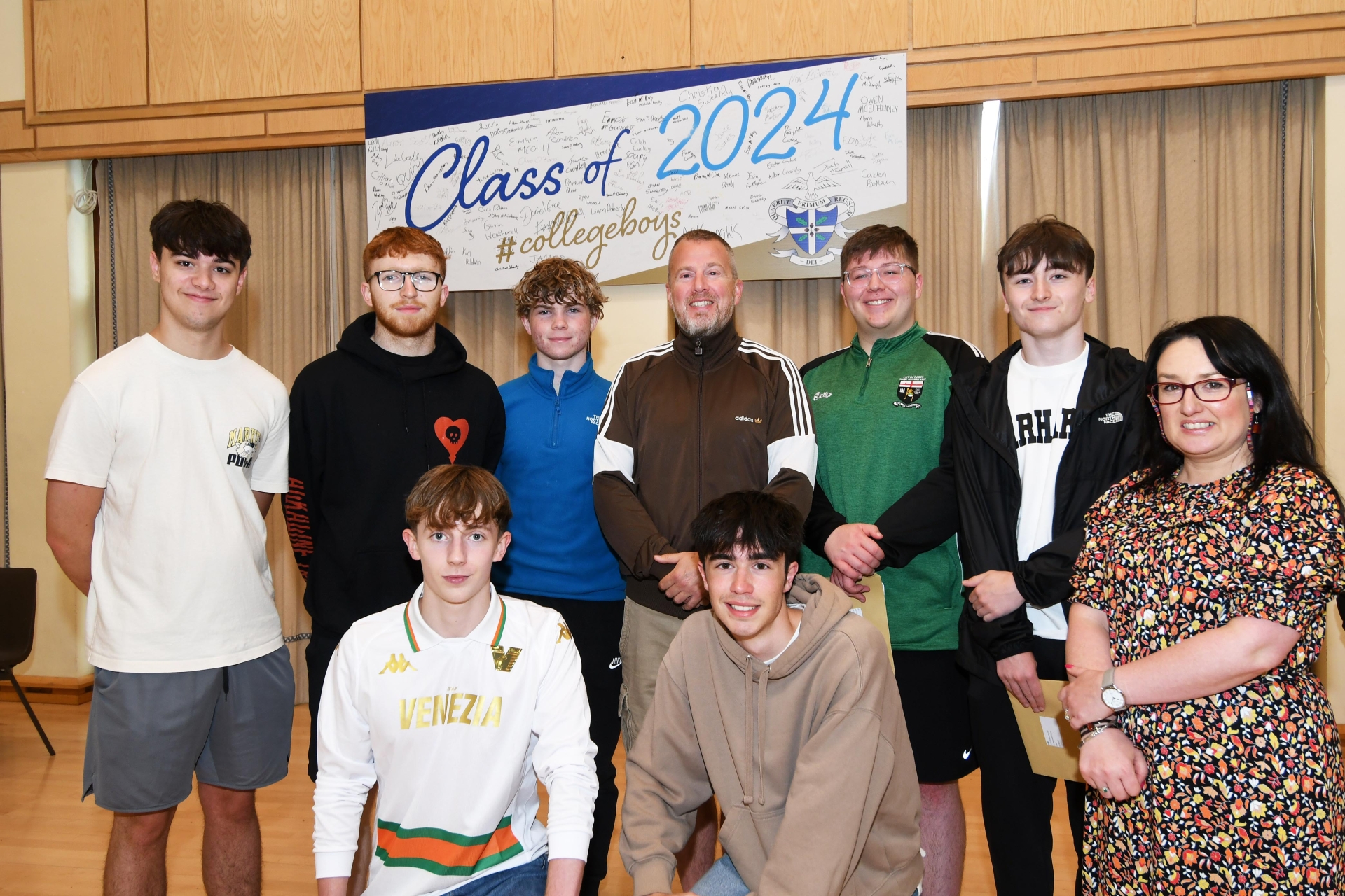 Caroline McLaughlin, Principal, and Michael McLaughlin, Head of Year 13, pictured with some of the high achievers at St. Columb's College on Thursday morning.