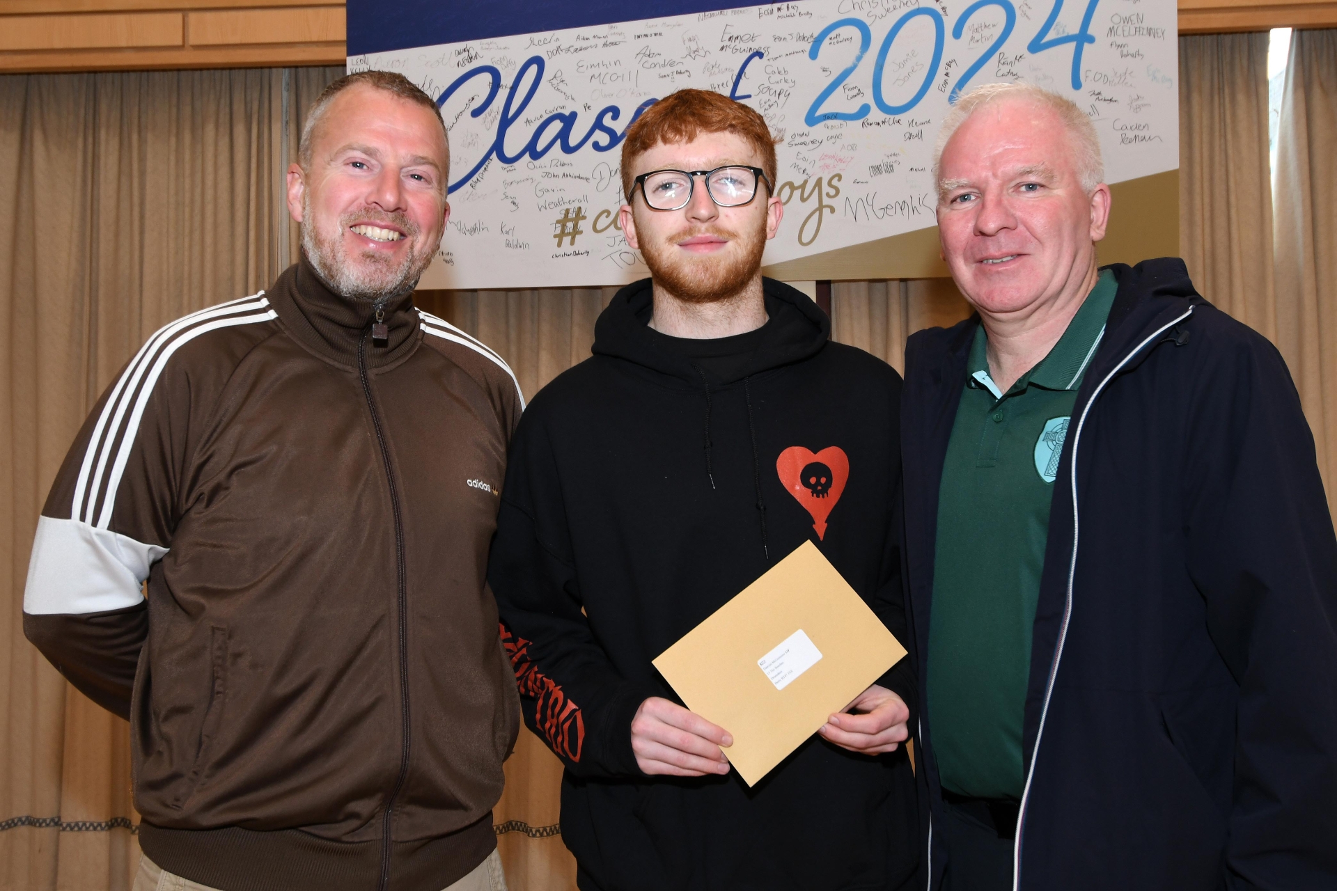 Damian McGuinness pictured with his proud dad Jim, right, and Michael McLaughlin, Head of Year 13, when he collected his results at St. Columb's College on Thursday morning.