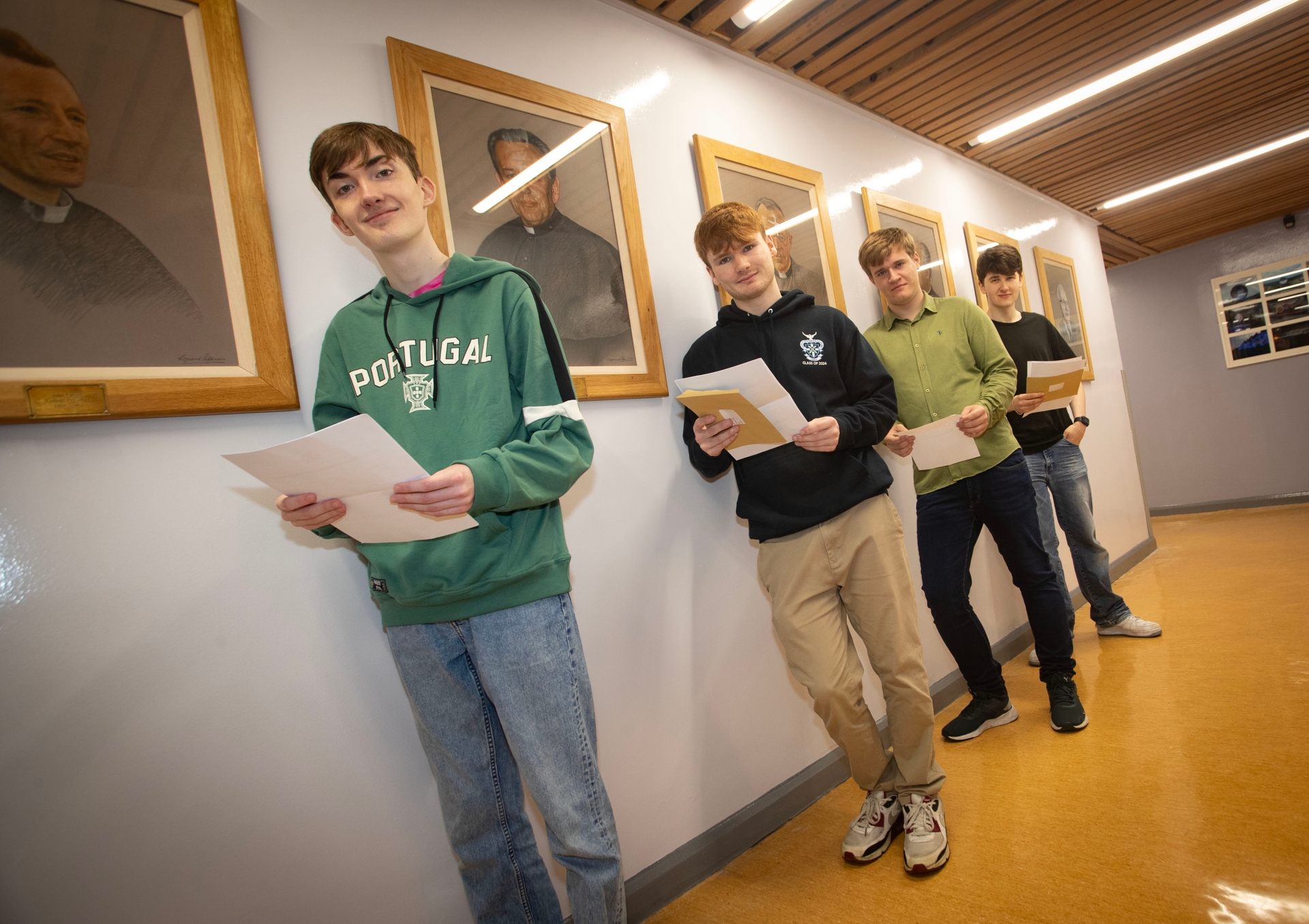 St. Columb's College A Level students happy with their results on Thursday morning. From left, Terry Bradley, James Tourish, Christian Kelly and Damian Romanowski.