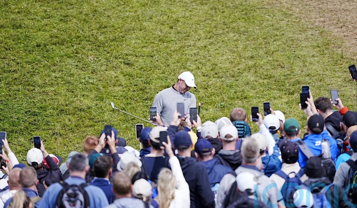 The crowds, ten deep in places, endured heavy rain showers in the early afternoon before the sun finally broke through not long before McIlroy himself appeared at the first fairway.