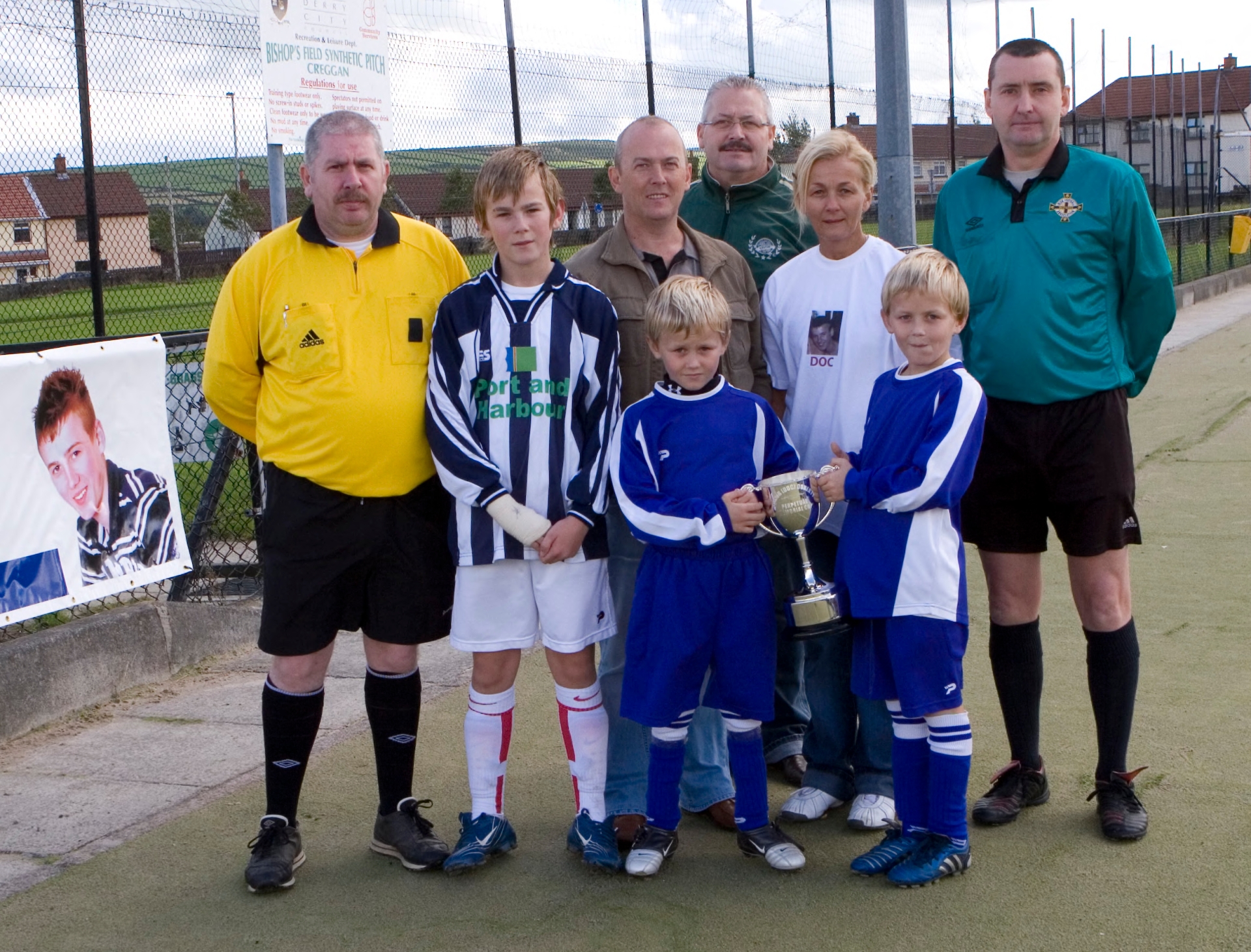 Group pictured at the launch of the Conor (Doc) Doherty Memorial Cup at Bishop's Field Astro Turf. Front, are Ronan, Shane and Emmett (brothers). Back, from left, are Leo Friel, referee, John Doherty (dad), Martin McGilloway, event organiser, Marcelline and Paul Murray, linesman.
