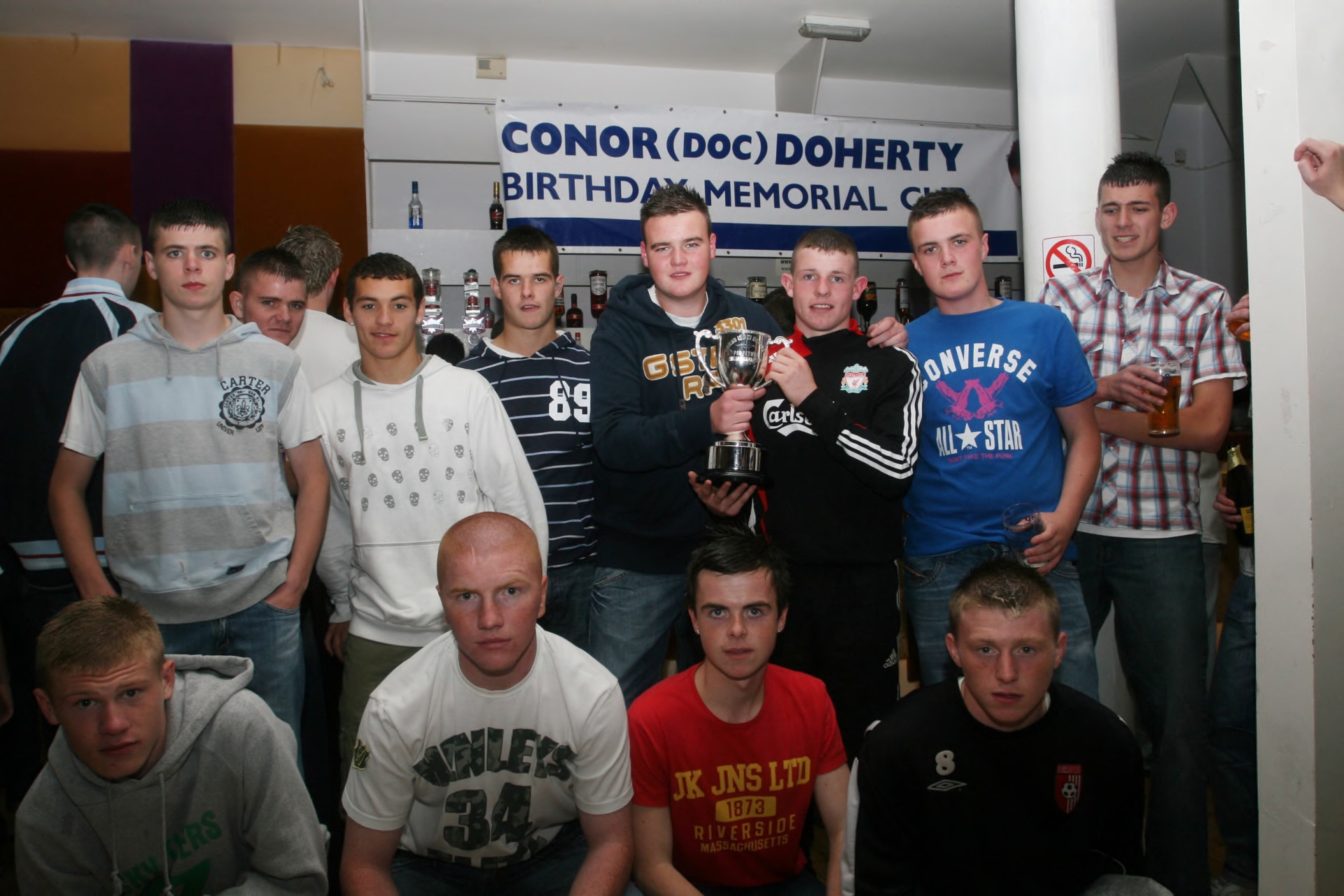 Pictured at Bar Zu, are the Creggan Devils, winners of the Conor' Doc ' Doherty Memorial Cup, Warren Rogan, Manager, Conor Morrow, Paul Simon, Caoinhin Moore, James McClean, Rory McCreadie, Mark McEleney, Patrick Fisher, Tony Rodgers & David McDaid.