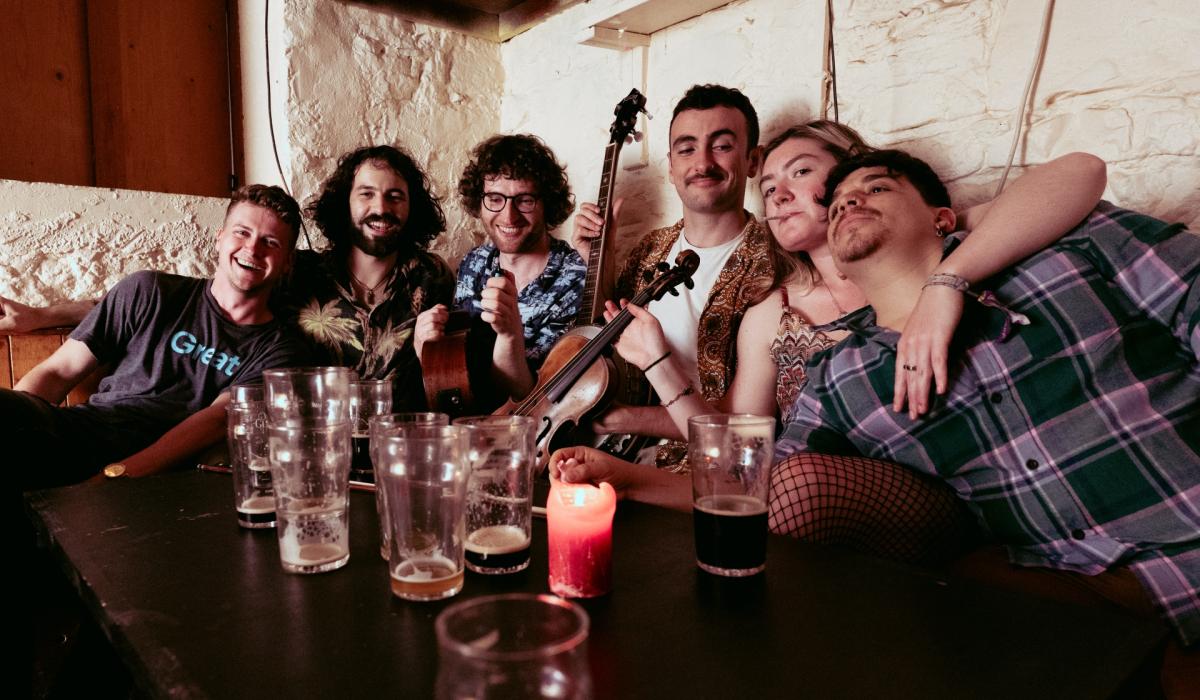 Kettle Boilers are Evan "The Shred" Costelloe (Acoustic Guitar, vocals), Jack "Stick Flips" Niland (drums, vocals), Connor "Goonz" Laffey (electric guitar, vocals), Pablo “Chilean karate champion 2013" Pallavicini (bass, vocals), Sophie "Is Ghaelgóir mé" Ní Choimín (vocals), and Luke "Reggie" Murphy (Banjo, fiddle, guitar, vocals) and have been cutting their teeth on the Galway pub scene over the past two years. I spoke to Luke, Evan and Sophie about the group and the upcoming gig: