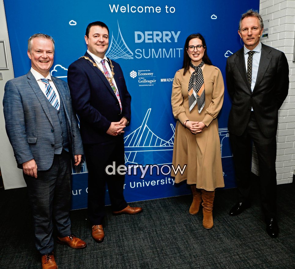Mayor Ruairí McHugh at the Derry Summit, held in the University of Ulster Magee Campus, with on left, Malachy O’Neill, Provost of the Magee, on right, RTÉ’s Tony Connelly and Sibley Berty, MW Advocate. (Photos - Tom Heaney, nwpresspics)