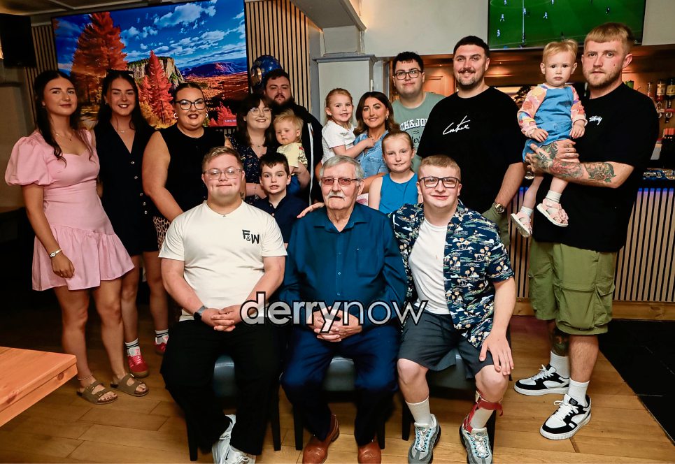 Jim Kelly celebrating his 80th birthday in the Branch Grill with grandchildren and great grandchildren.