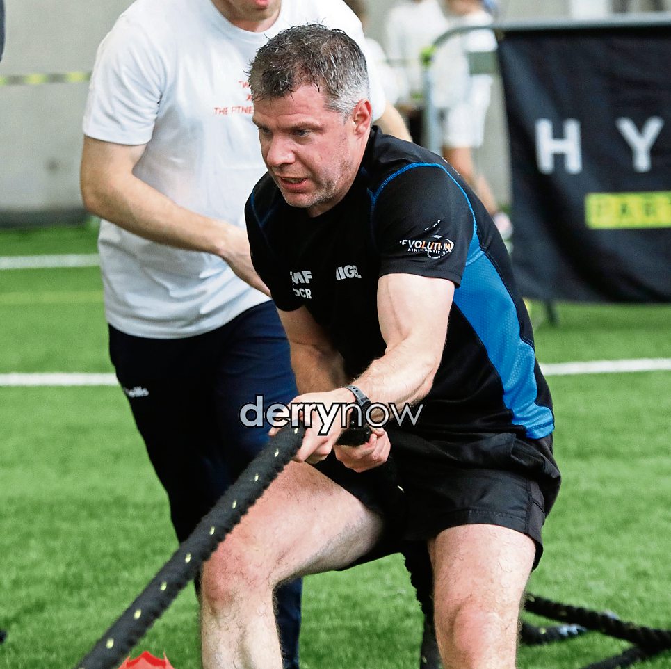 Showing determination as this contestant take part in the Maiden City Hyrox event held in Sean Dolans GAA Club.