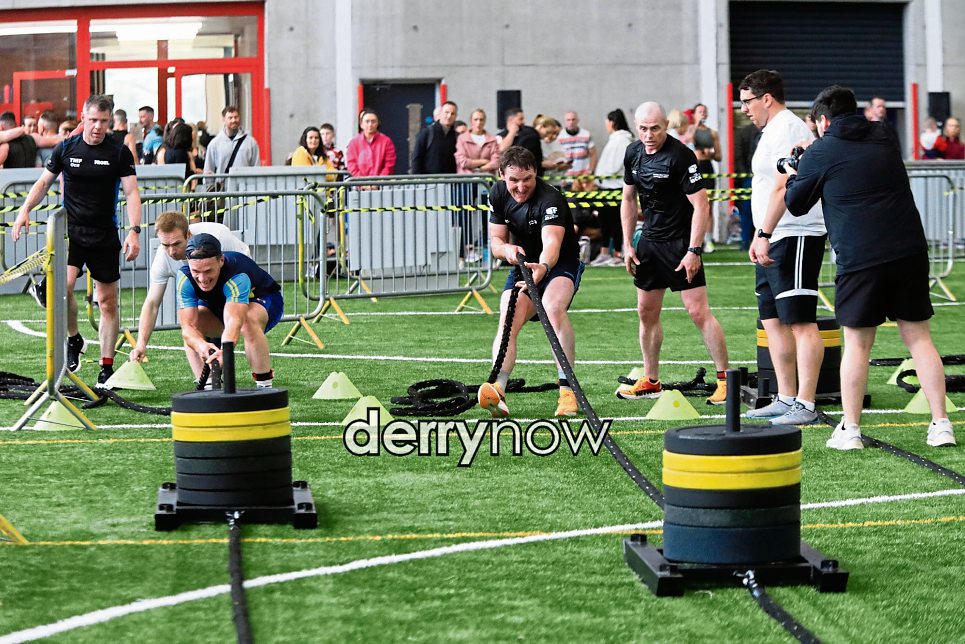 A contestant competes in the sledge push in the Maiden City Hyrox event held in Sean Dolans GAA Club.
