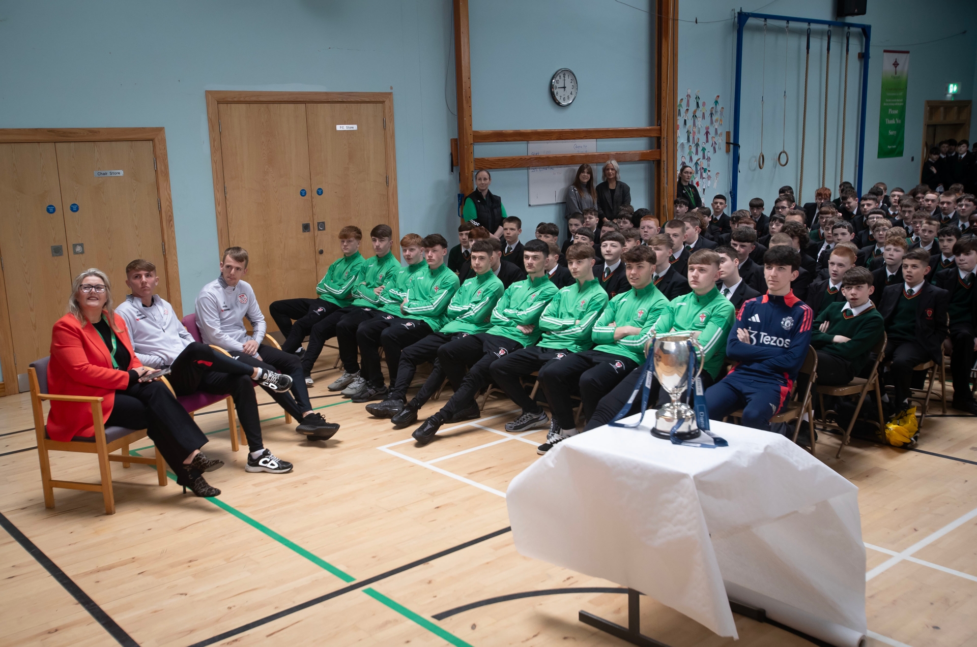 Derry City players and former St. Joseph’s students Ciaran Harkin and Glenn McCourt were at the school’s morning assembly on Thursday to congratulate the u-18 team on their recent excellent success in bringing the Danske Bank NI u-18 Cup to the Creggan school for the first-time last week.
