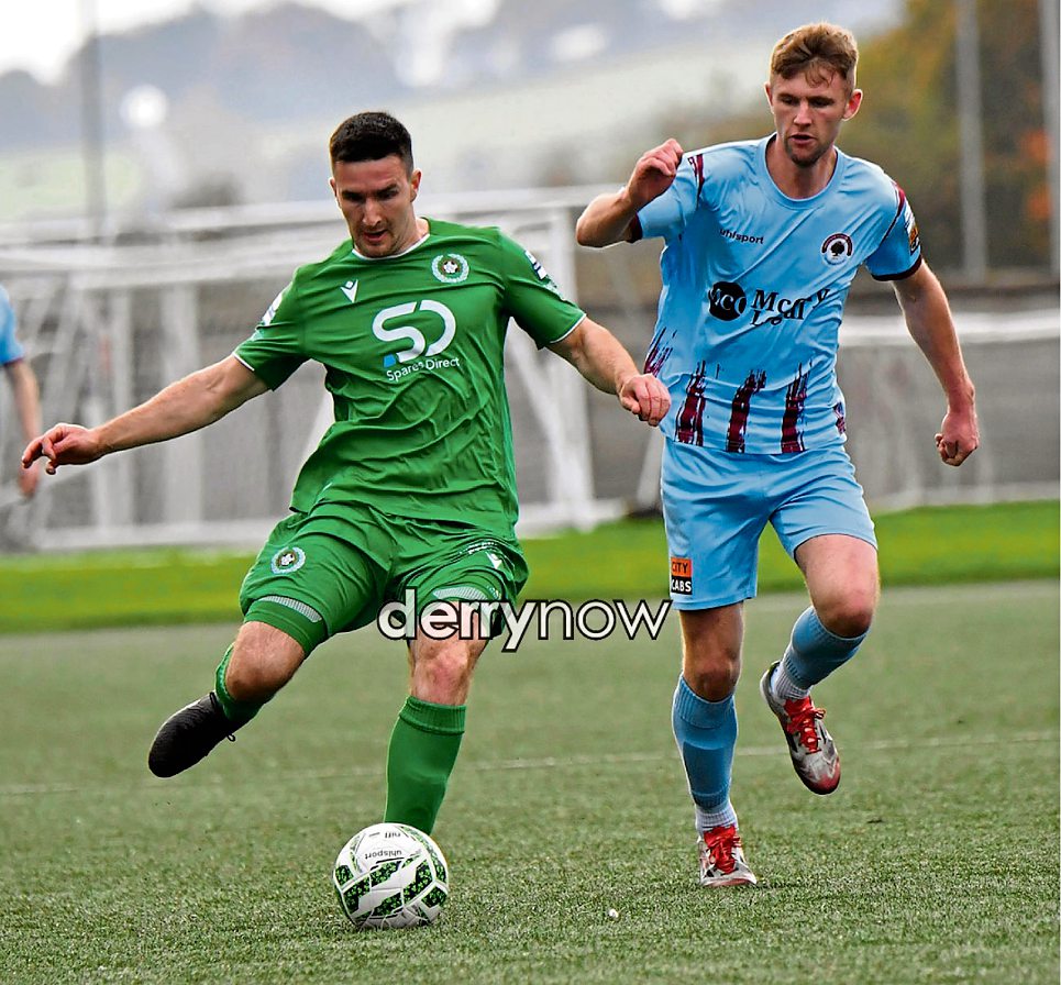 Institute's Padraig Lynch closes in on Dundela's Michael Kerr.