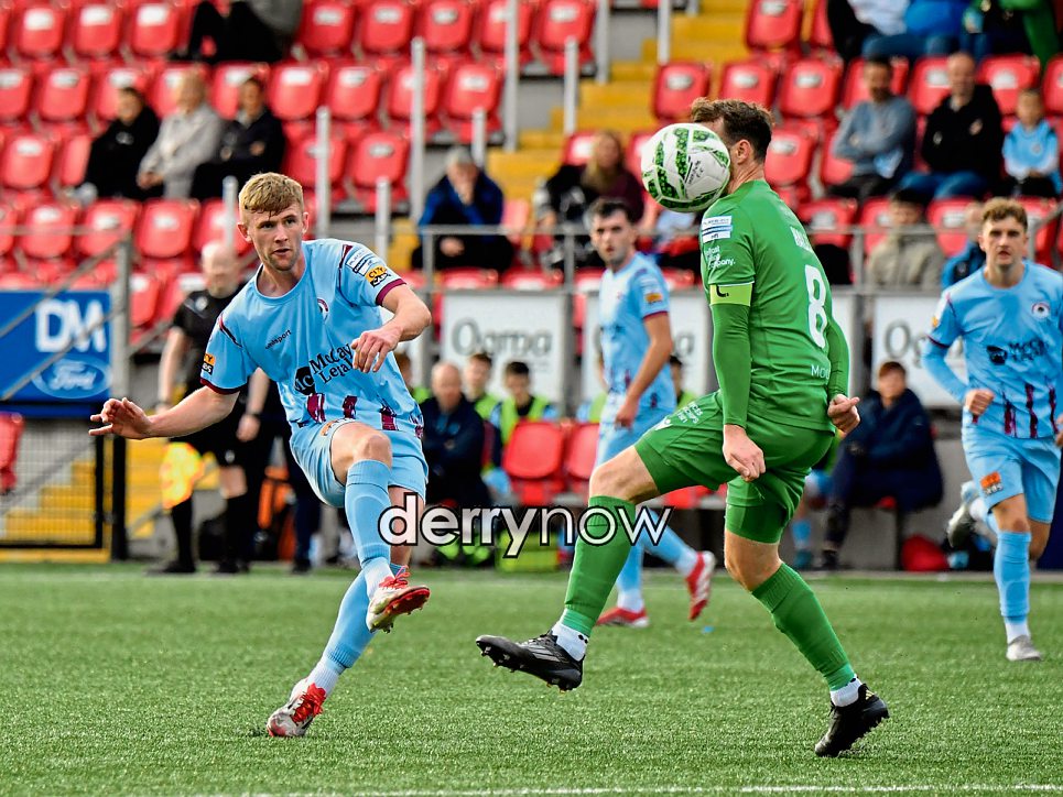 Dundela's captain Andy Hall blocks a shot from Institute's Padraig Lynch. (Photos - nwpresspics)