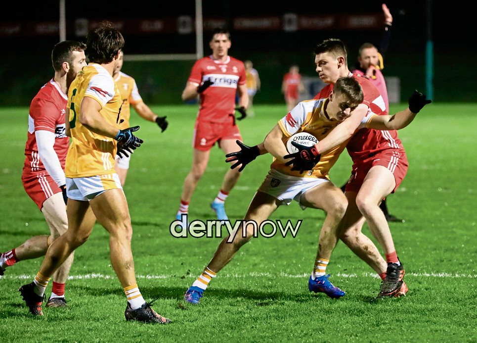 Derry defeated Antrim on a score-line of 2-16 to 0-07 in Wednesday night’s Dr. McKenna Cup clash at Owenbeg