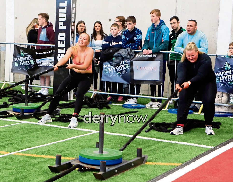 Participants taking part in the sled pull circuit at the Maiden City Hyrox event.