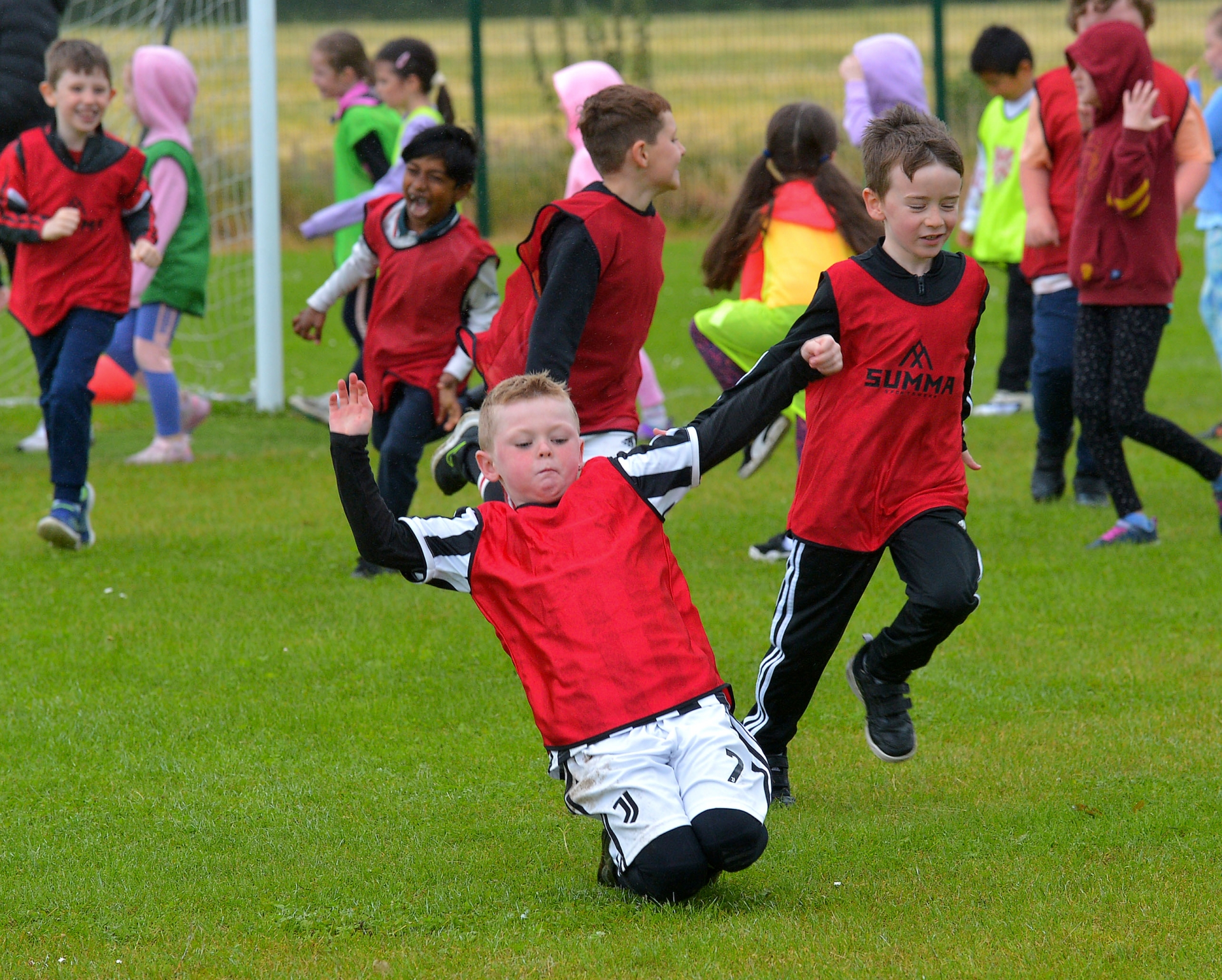 Oisin ‘Ronaldo’ Maguire from Good Shepherd Primary School took celebrates scoring a goal in the Eglinton/Ballymoor Football Festival at Broadbridge Primary School. Photo: George Sweeney, nwpresspics