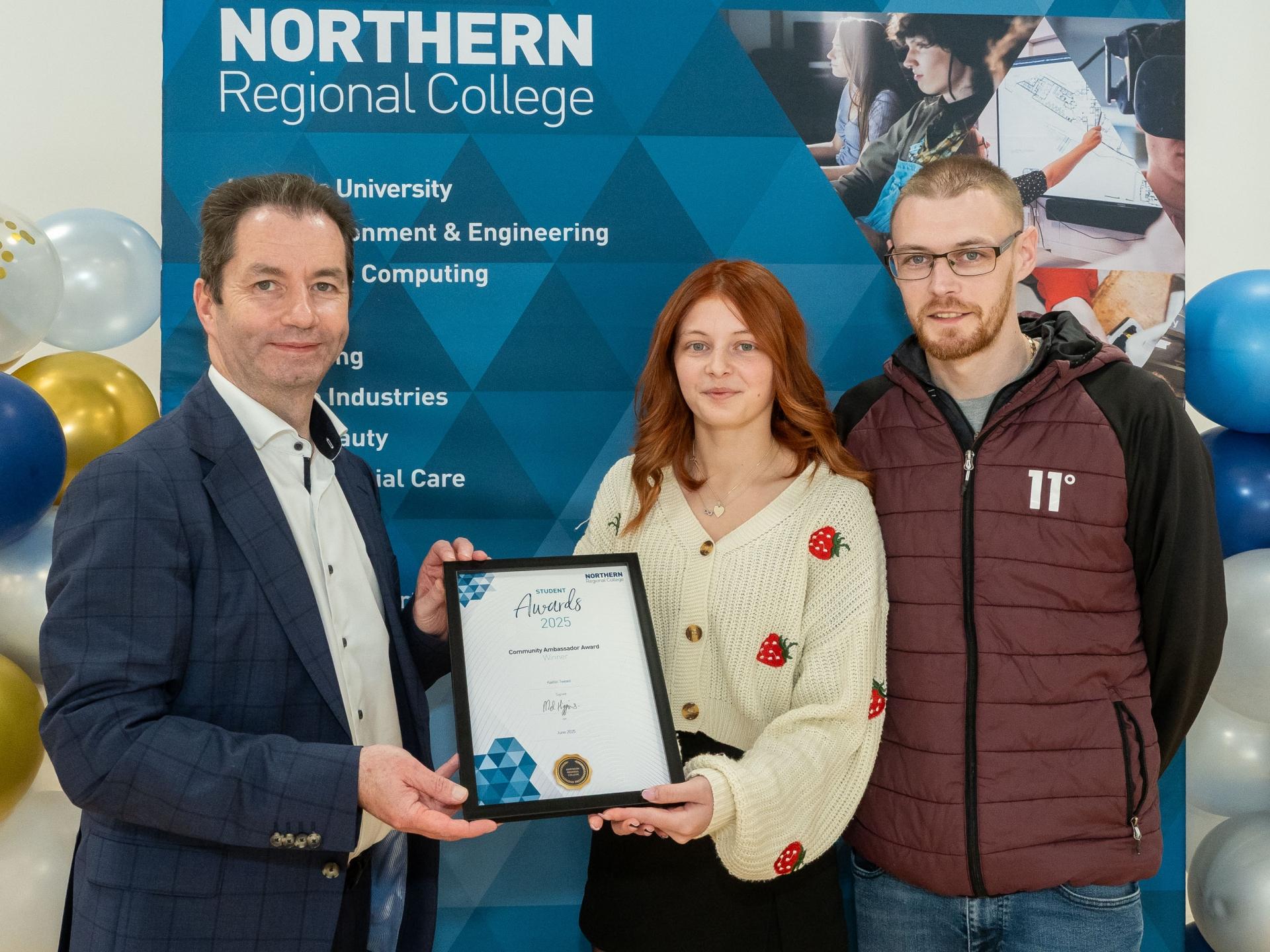 Kaitlin Tweed winner of the Community Ambassador Award and her father Michael Tweed with Mel Higgins, College Principal & Chief Executive.